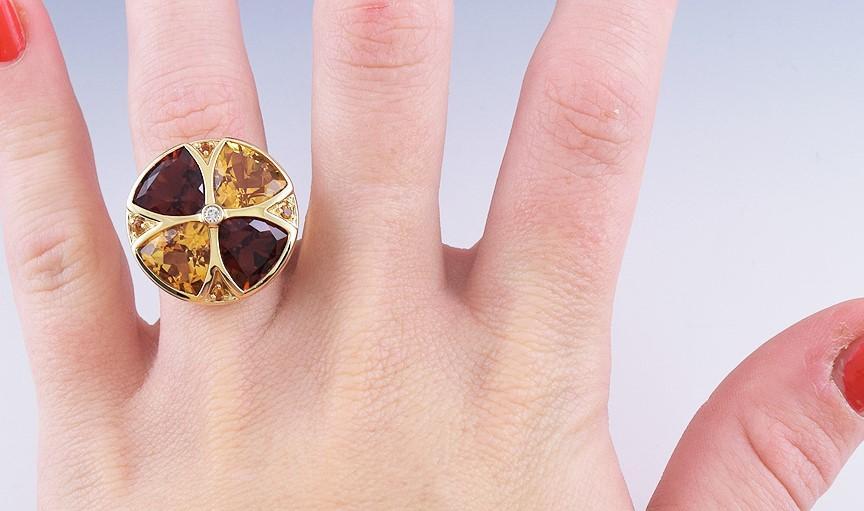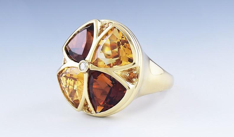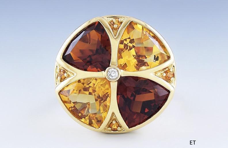 Presented is an eye-catching 14 karat gold, citrine and diamond ring. This is a modern piece, made in China. The ring is set with four triangle cut citrines, two in a dark orange shade and two in a lighter honey yellow. The triangle cut citrines are arranged in a sort of four leaf clover design, with a diamond in the center and little round cut citrines in the four corners. The ring setting is sleek and well made, certainly by a high end maker or designer.
