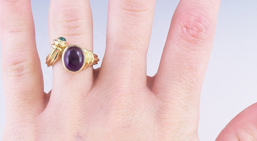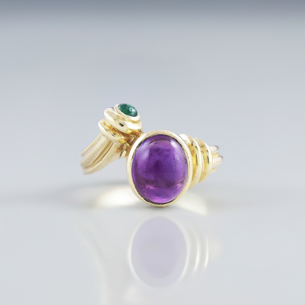 Presented is an eye-catching amethyst and emerald ring in 14 karat gold. This is a modern piece, likely made in America. The central focus of the ring is an oval cabochon amethyst. The ring setting makes a sort of bypass design, ending in a round cabochon emerald. The design is quite sleek and stylish, and very flattering on the hand.