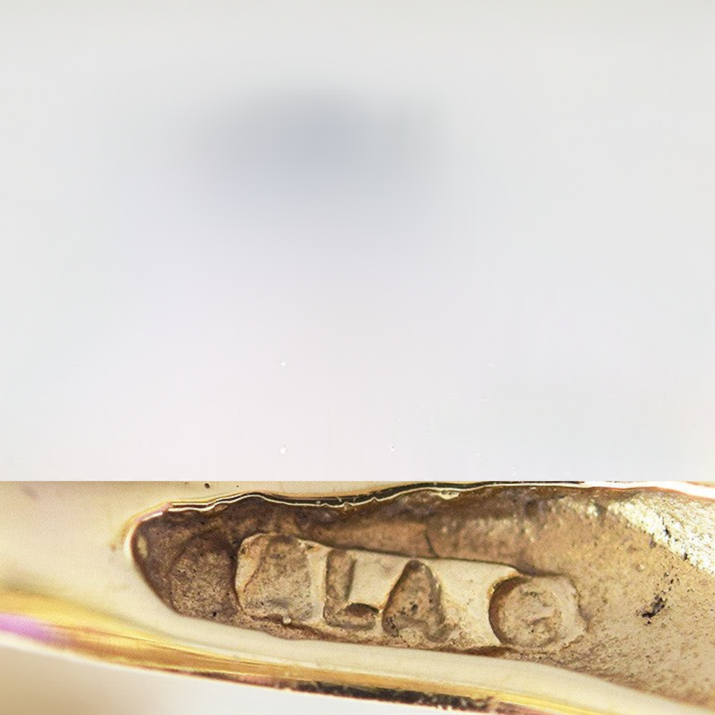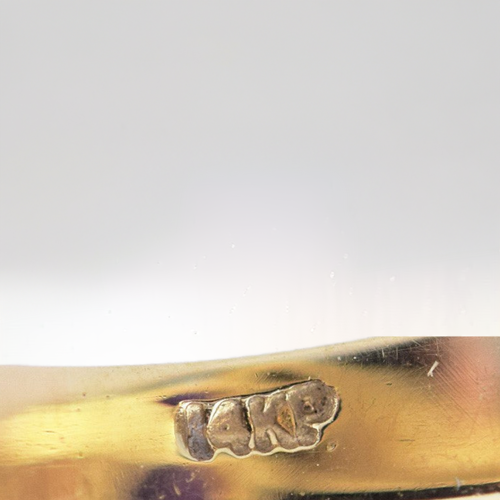 The band is stamped and guaranteed 14kp and has a maker's mark of ALA, with a copyright symbol. The p in the 14k stamp stands for 'plumb,' meaning 'exact.'