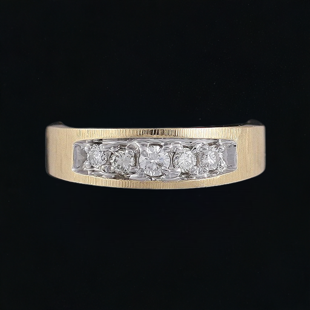 Presented is a fine 14K gold and diamond ring made around the 1960s or 1970s. The ring is composed of five modern round brilliant cut diamonds in a nicely textured, heavy weight yellow gold setting. The largest of the diamonds at the center is about 8-10 points in size each. We estimate the total diamond weight to be around 25 - 28 points. The diamonds are all SI clarity or better. The center stone looks to have VS clarity and I color.