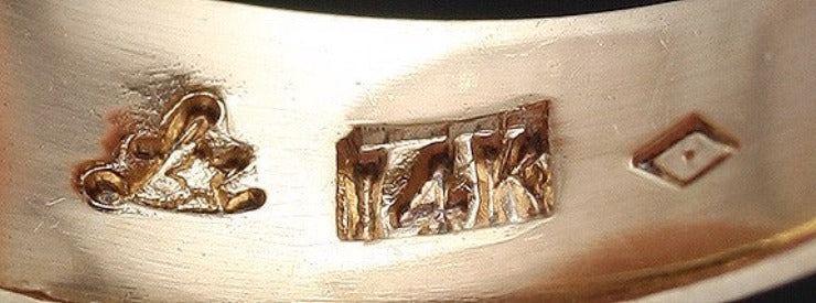 The ring is marked on the inside of the band with 14K and a maker’s mark. We have tested it with nitric acid and guarantee it to be 14K gold.