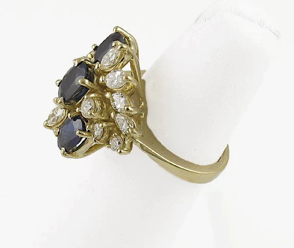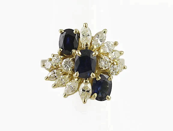 Presented is an attractive modern 18K gold, sapphire and diamond ring. The three oval shaped sapphires at the center of the ring have great color. They are about ½ to ¾ carat each, for a total carat weight between 1 1/2 ct to 2 1/4 ct. The sapphires have 3 modern round brilliant cut diamonds and 4 marquise cut diamonds on each side. The round stones range in size from 4 to 6 points, and the marquise stones are between 4 and 8 points for a total diamond weight of at least 70 points, if not 3/4 carat. As far as color, they are on the yellow side, almost a champagne shade. These are not pure white stones, but they are clean stones with VS clarity.