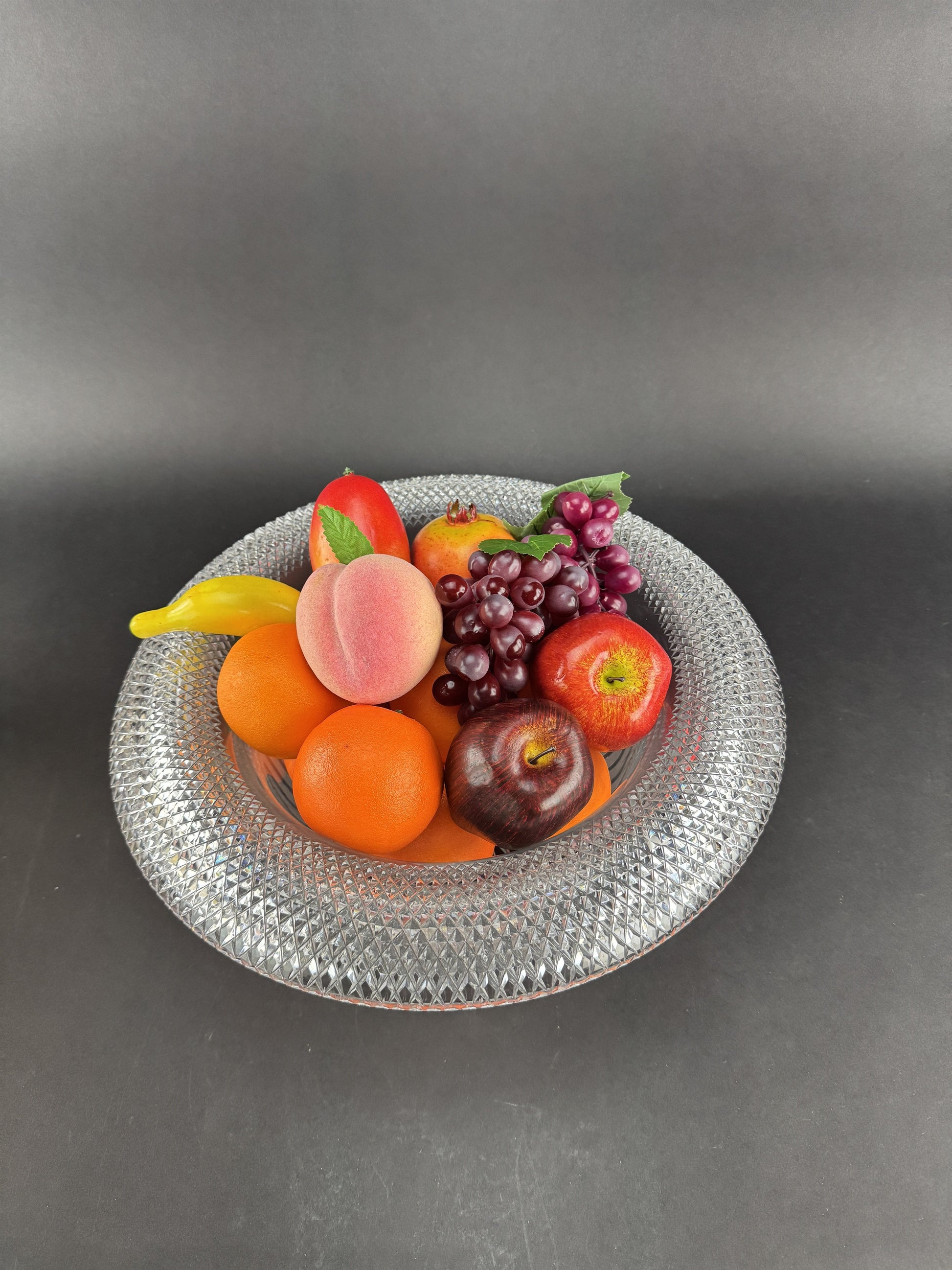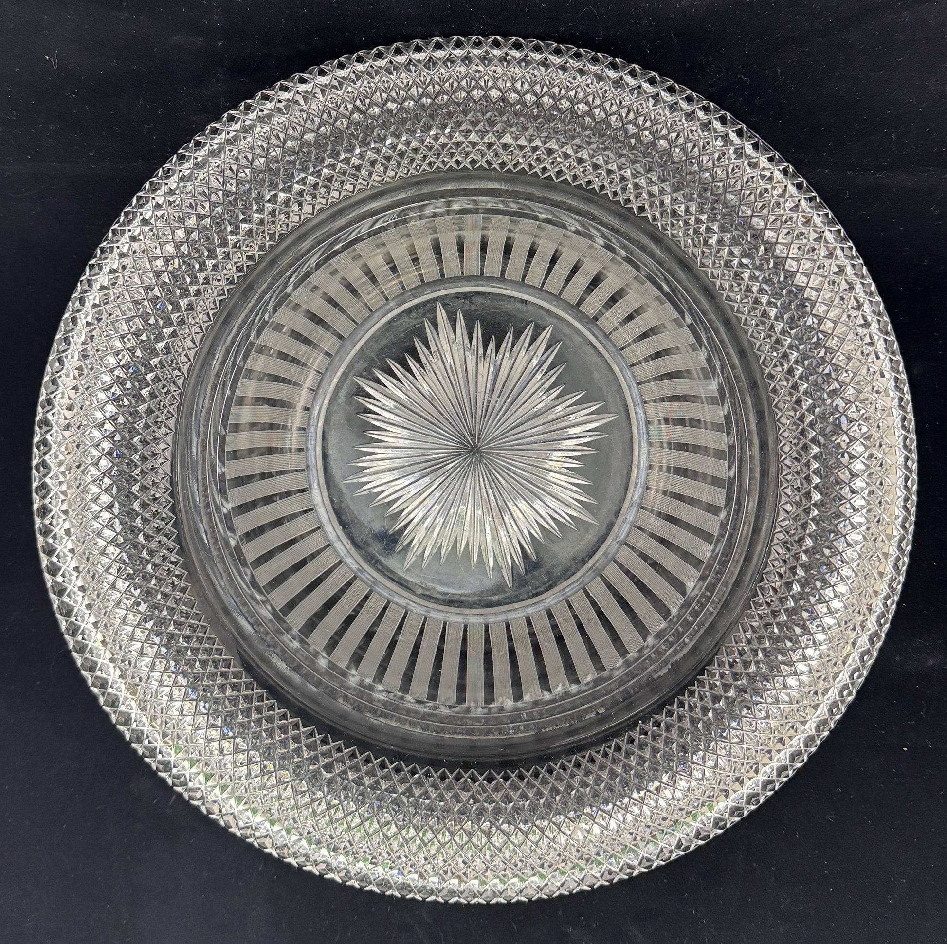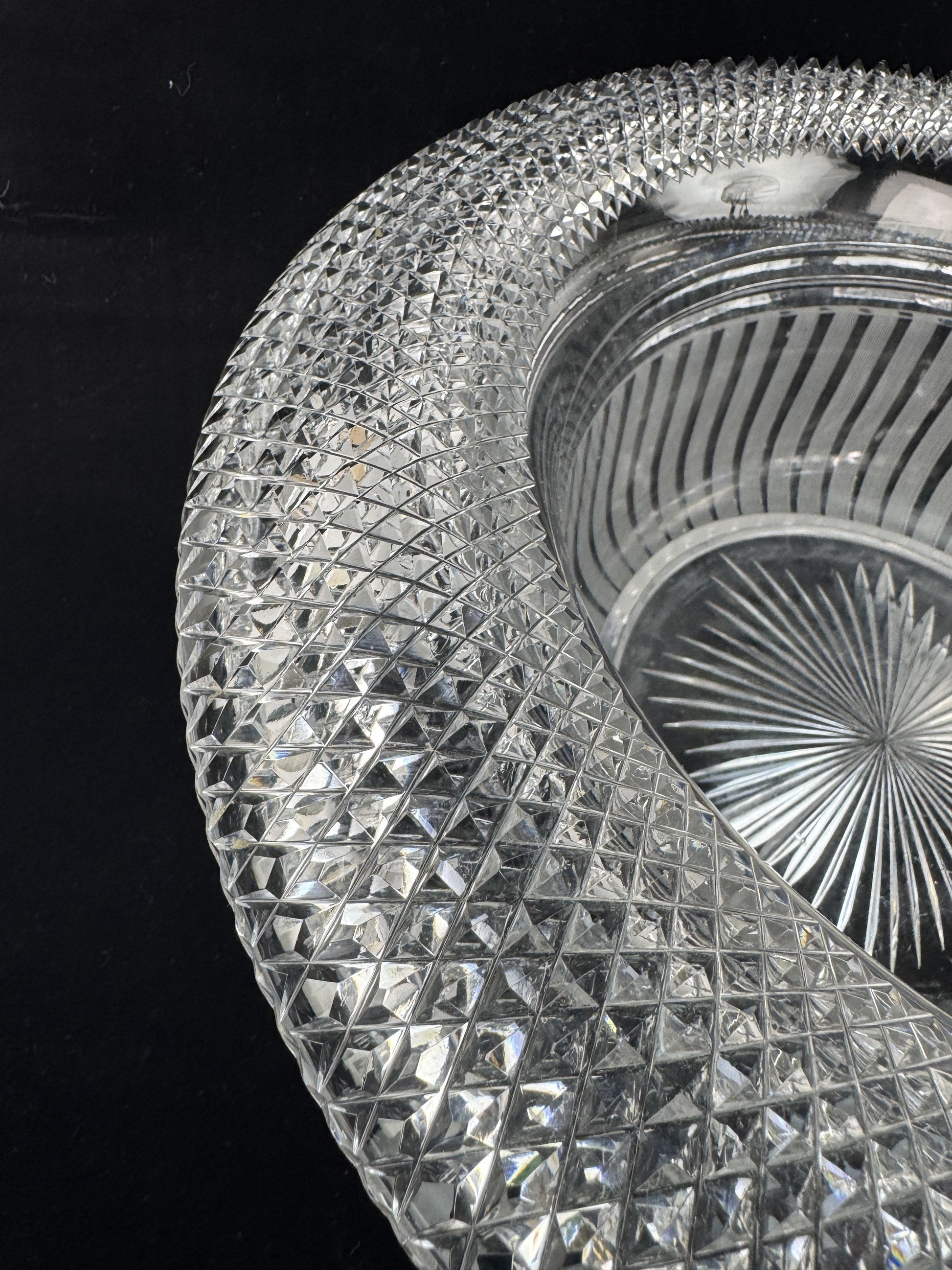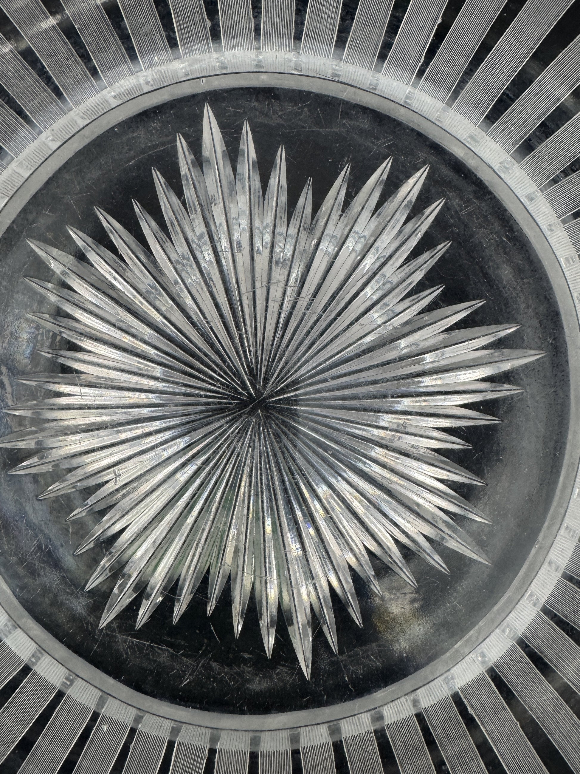 This piece is in excellent overall condition. There is some shelf wear to the underside, as you'd expect. The center interior has some minor surface abrasions, but these will not be noticeable if the bowl is in use, filled with fruit, a centerpiece arrangement, etc; even empty, the starburst design cut into the underside makes them less noticeable. The diamond cut design around the rim has some minor flakes to some of the points, but nothing significant. The rim and body have no chips, no cracks, no breaks, and no repairs.
