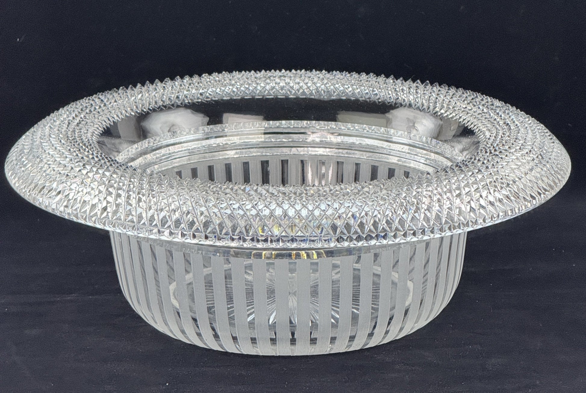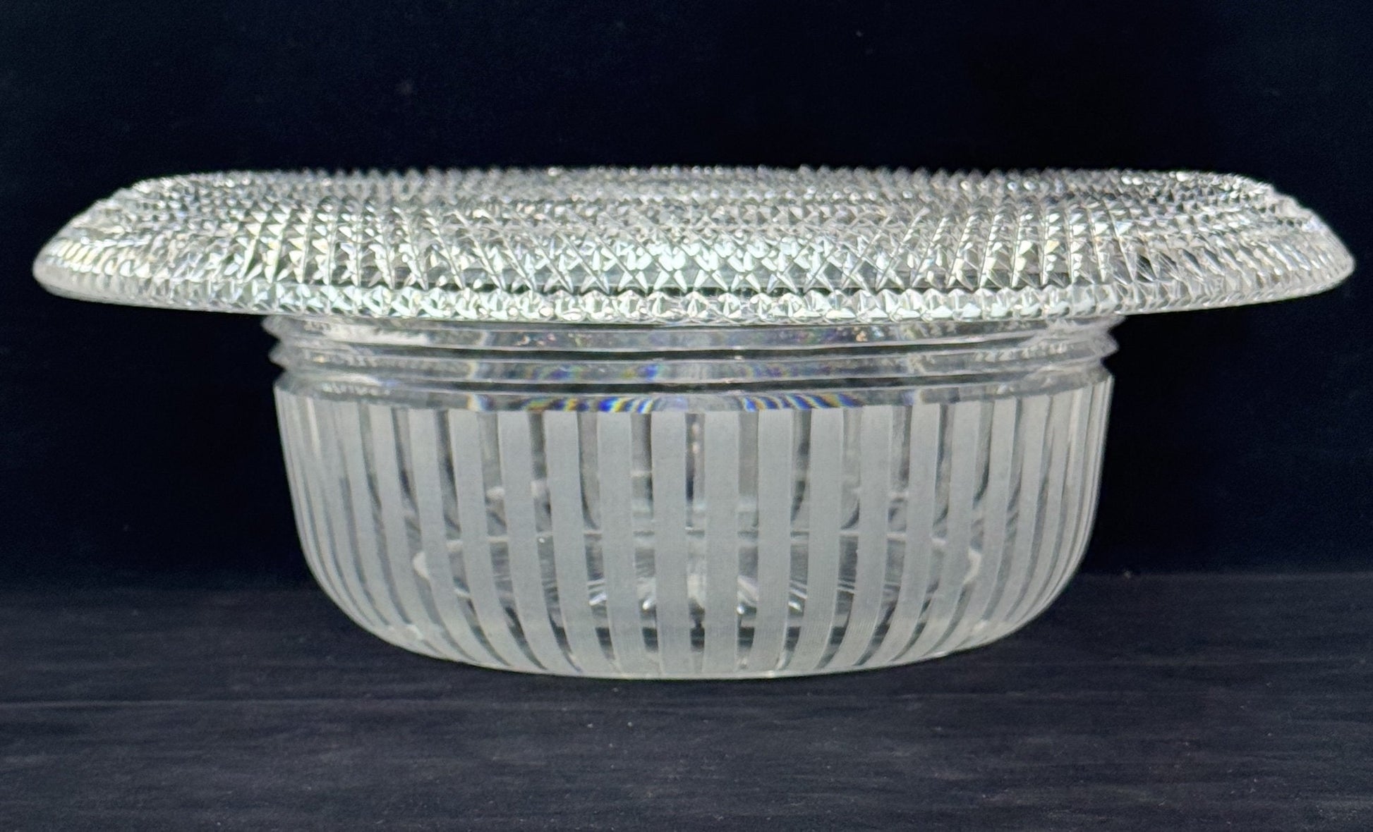 Presented is a superb quality American Brilliant Period cut glass centerpiece or fruit bowl, dating to circa 1880-1915. The bowl is unsigned, as is fairly common with ABP pieces, but the quality of the glass and decoration suggest a high end maker like Hawke's, Pairpoint, Tuthill, etc. The bowl is beautifully cut and frosted around the sides with a vertical stripe design, while the wide, downturned rim has a diamond cut design which catches the light dazzlingly.