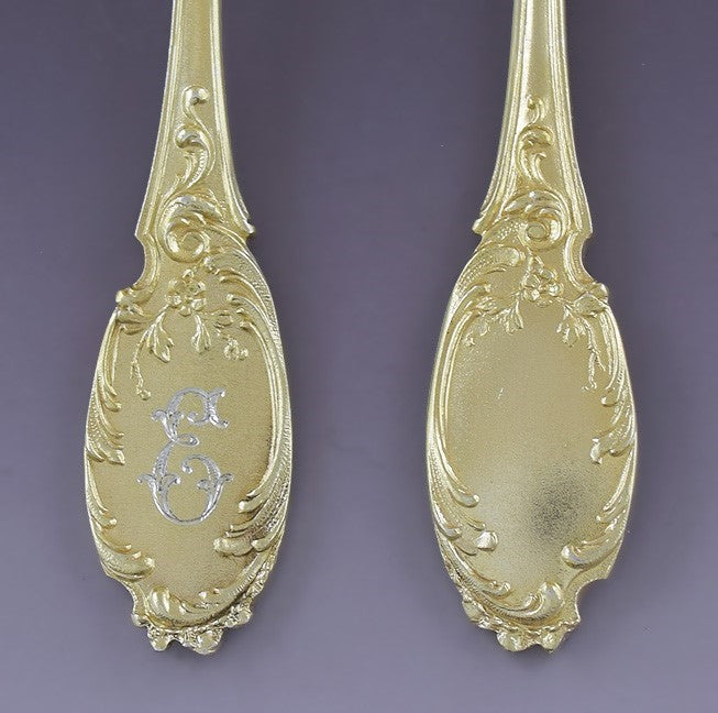 Presented is a fabulous German silver 18 piece dessert set. This set was made by Bruckmann & Sons and dates to the late 1800s or early 1900s. The set consists of 17 dessert spoons and one large server with a wide, shallow bowl or blade. The handles have a lovely design of flowers and foliate scrollwork against a crisp matte finish. The blade or bowl of the serving piece is beautifully hand engraved with intricate decoration in the form of foliate scrollwork and flowers, very detailed and well done. The pieces all have a rich, vibrant gold wash. Each piece has a monogram of E in decorative script on the front of the handle, showing the silver beneath the gold for a very attractive two-tone effect.