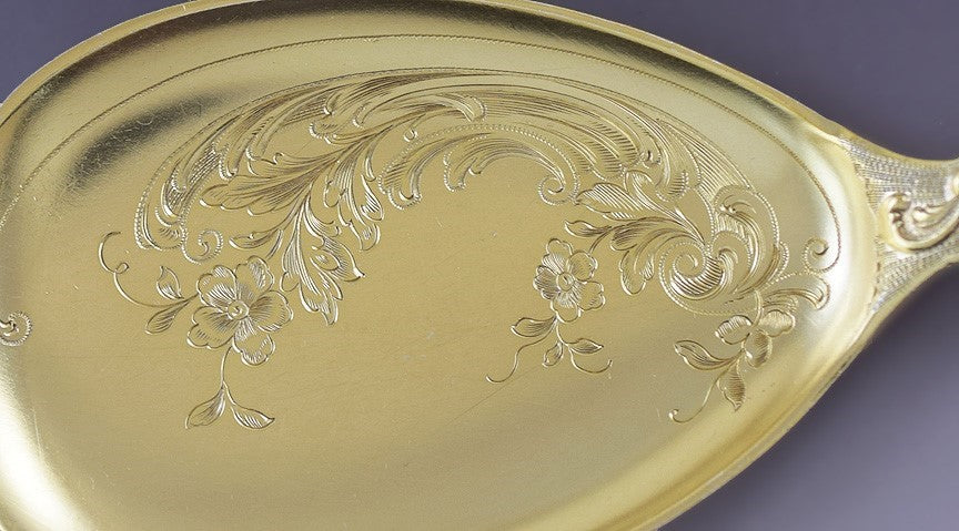 This set is in excellent condition. The details of the engraved designs and the finish are nice and crisp. These items do not look like they have seen any use. There are no splits, no breaks, no dents, no cracks, no monogram removals, and no repairs.