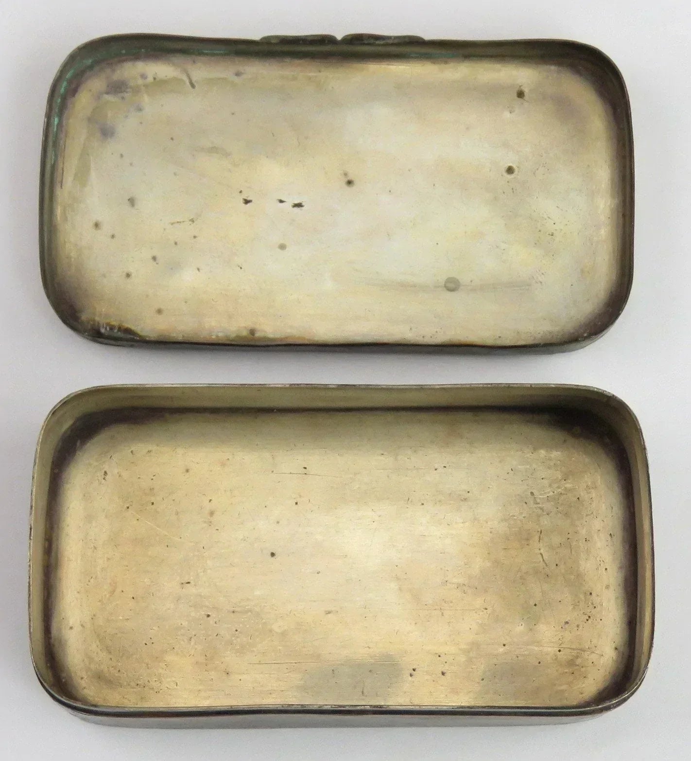 This piece is not stamped or hallmarked, but we have tested it with nitric acid and guarantee it to be silver. The snuff box is in good overall condition, particularly considering the age and material. The silver is in great shape, with no splits, no dents, no breaks, no monograms, no monogram removals, and no repairs. There was likely a hinge at once point in time, but there no longer is, although the lid still shuts nicely. The scene on the lid has some cracklature, and the paint has some minor losses here and there throughout, so please view the photos carefully and let them be your guide. The scene on the underside is in the best condition out of all the sides. The box measures about 3 ¼ by 1 5/8 by 7/8 of an inch, LxWxH. The box weighs 49 grams or 1.7 regular ounces.-jm