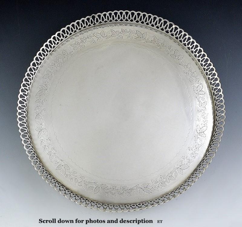 Presented is a fantastic quality Portuguese silver tray, quite large and made from .958 purity silver, from between 1818-1853, more probably 1843-1853. This purity level of silver is actually higher than sterling silver, which is .925, so this is a piece made from very high quality materials. The piece is raised up on three legs, and has an openwork rim in an attractive design. The interior is beautifully hand-engraved with a pattern of leaves and grapes. This is a truly fabulous piece of silver work, and would be an exceptional addition to any home or collection.