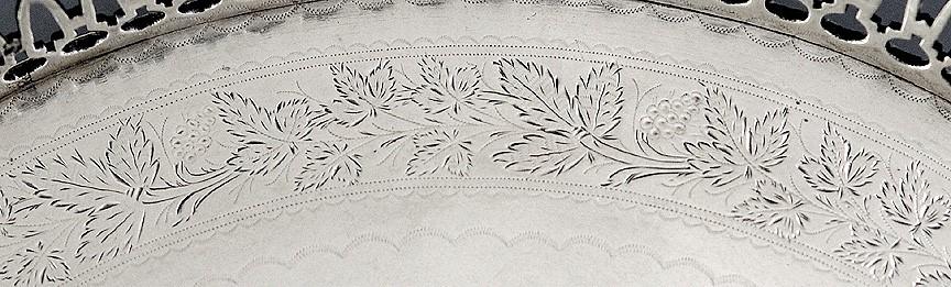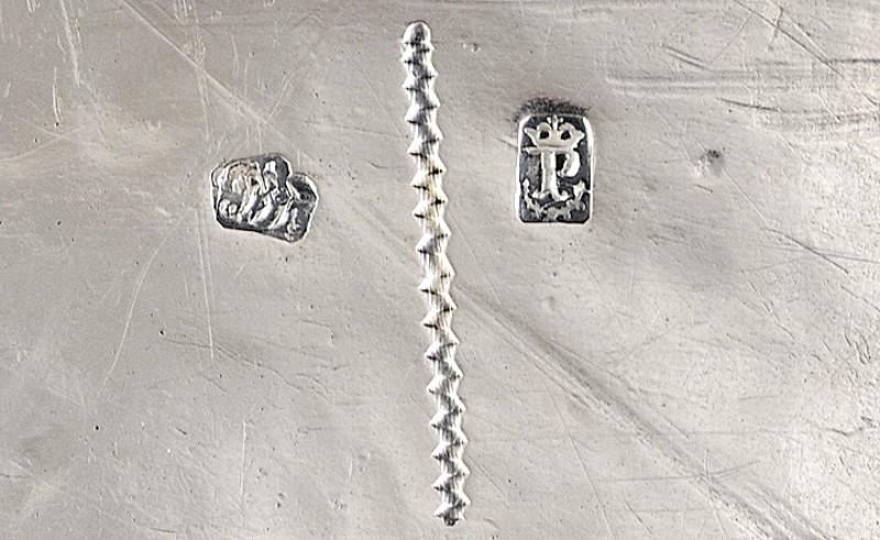 The underside of the tray has the p mark for Oporto, but we are unable to determine if it is the mark used between 1818-1836, 1836-1843, or 1843-1853, as it contains elements of all three, but we estimate that it is the later date range. The zig-zag line is the mark where the assay office took a sample of silver in order to test its purity.