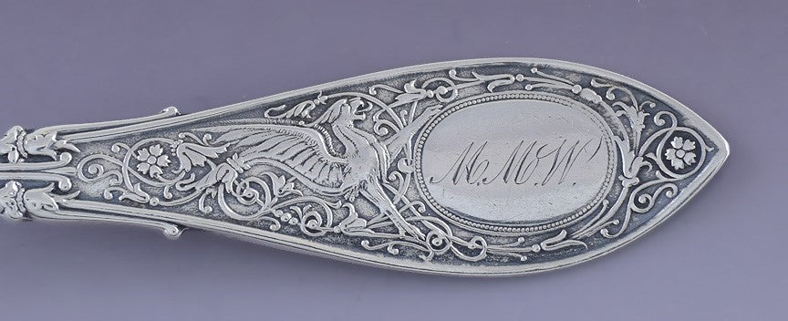 Presented is a fabulous set of 12 Whiting sterling silver teaspoons. This set is done in the beautiful Arabesque pattern, which began production in 1875. This is an ornate pattern with elegant scrollwork and florettes on the handles, surrounding a design of a stylized dragon or griffin. The creature is bracing an oval cartouche, monogrammed MMW.