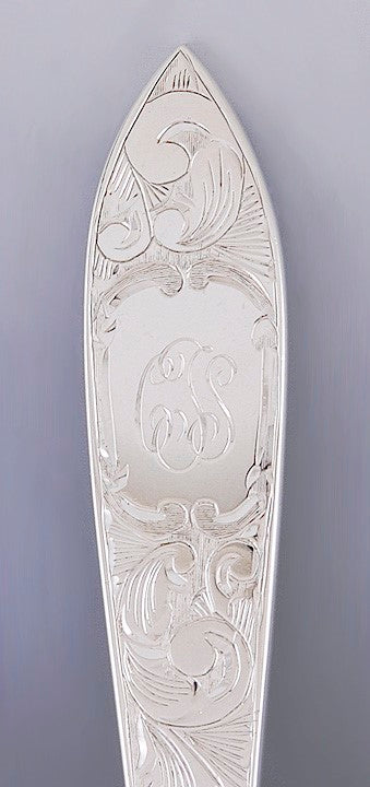Presented is a fabulous set of 12 sterling silver iced tea, sundae, or parfait spoons. These spoons were made by Schofield Co of Baltimore, Maryland. The spoons are done in the elegant Lorraine pattern, which began production in 1896. This pattern is virtually identical to the Mayflower pattern by Kirk. The handles of the spoons are beautifully engraved with scroll and flower designs. On the terminal of the handle is a cartouche. Each of the spoons is monogrammed on the handle with CTS in flowing script.