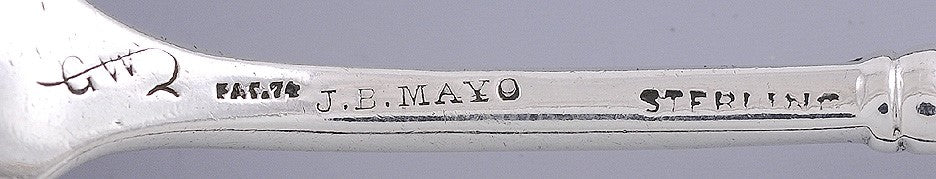 Two of the spoons are stamped with the old style Shiebler maker's mark as well as sterling and the patent date of 1874, as well as the retail mark for J.B. Mayo. The remaining spoons are stamped with the newer winged-S Shiebler mark, as well as sterling, and patent.