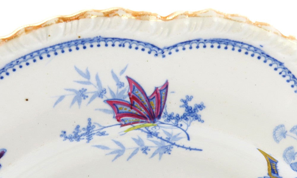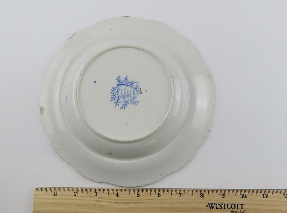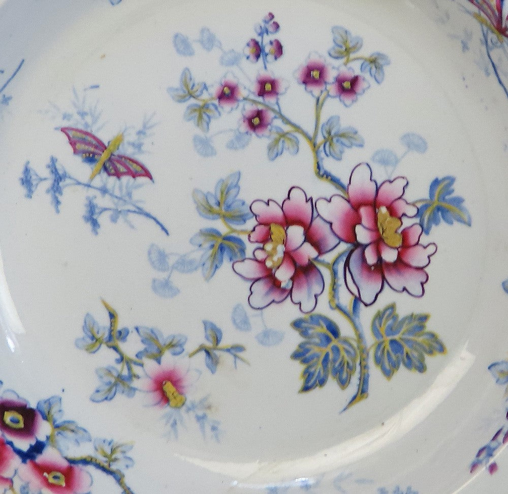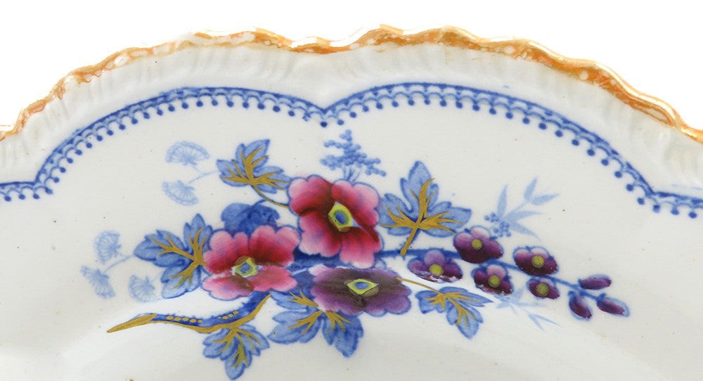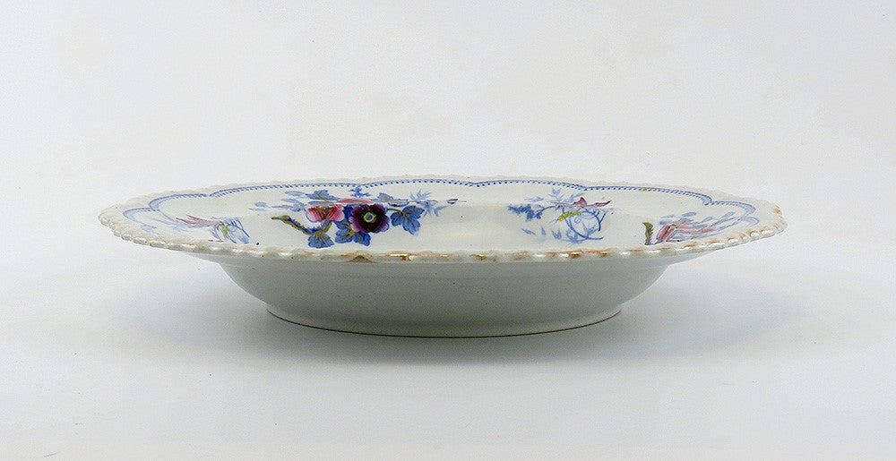 Presented is a lovely set of 8 Staffordshire stone china wide rim soup bowls. These bowls date to around the 1830s-1850s and were made by John & William Ridgway. The bowls are made in the 'Japan Flowers' pattern, which as the name suggests features colorful floral designs with gilt detailing. The palette is quite distinctive, done in blue and varying shades of pink and purple. The bowls have a wide, scalloped rim and a generous 'well' in the center, in the form sometimes called a soup plate, though of course it can be used however you like.