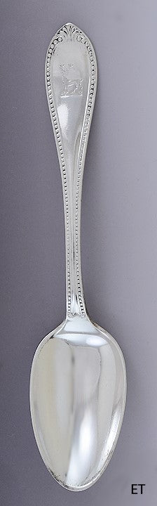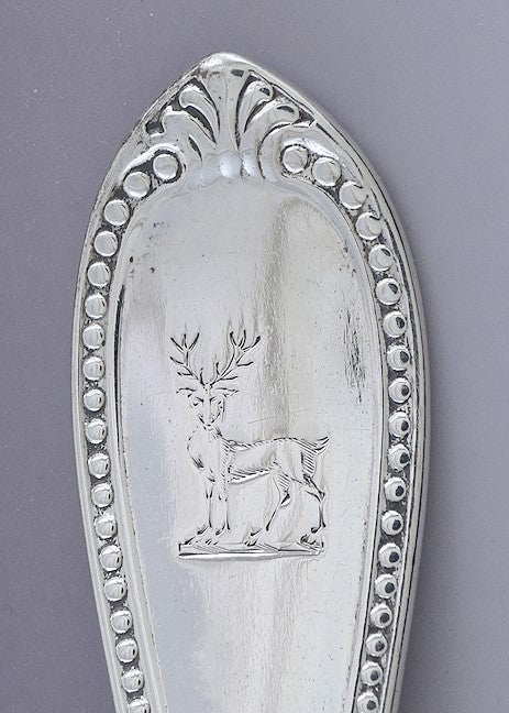 Presented is a great Tiffany & Co sterling silver serving spoon. This spoon is made in the Bead pattern, which began production in 1850 under John Polhemus, a renowned silversmith who designed and produced many much-loved silver patterns for Tiffany. This spoon dates to around the 1850s-1860s. As the name suggests, this is a stylish beaded pattern with a foliate design at the tip of the handle. The spoon is well made from thick, heavy gauge silver, with a nice feeling of weight and balance in the hand. The spoon has a finely engraved crest of a stag on the handle.