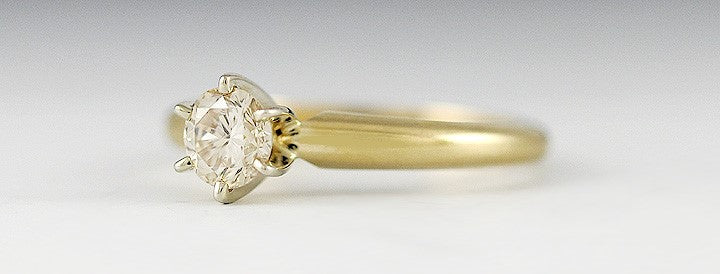 Presented is a fabulous 14 karat gold and diamond solitaire ring. This is a modern ring, likely made in America. The diamond is 5 millimeters in diameter, of SI clarity and J color, at least half a carat in size. This ring is made in a very traditional style, this ring is what comes to mind when someone says 'engagement ring'. It's a very elegant ring, appealing in its simplicity and classic design.