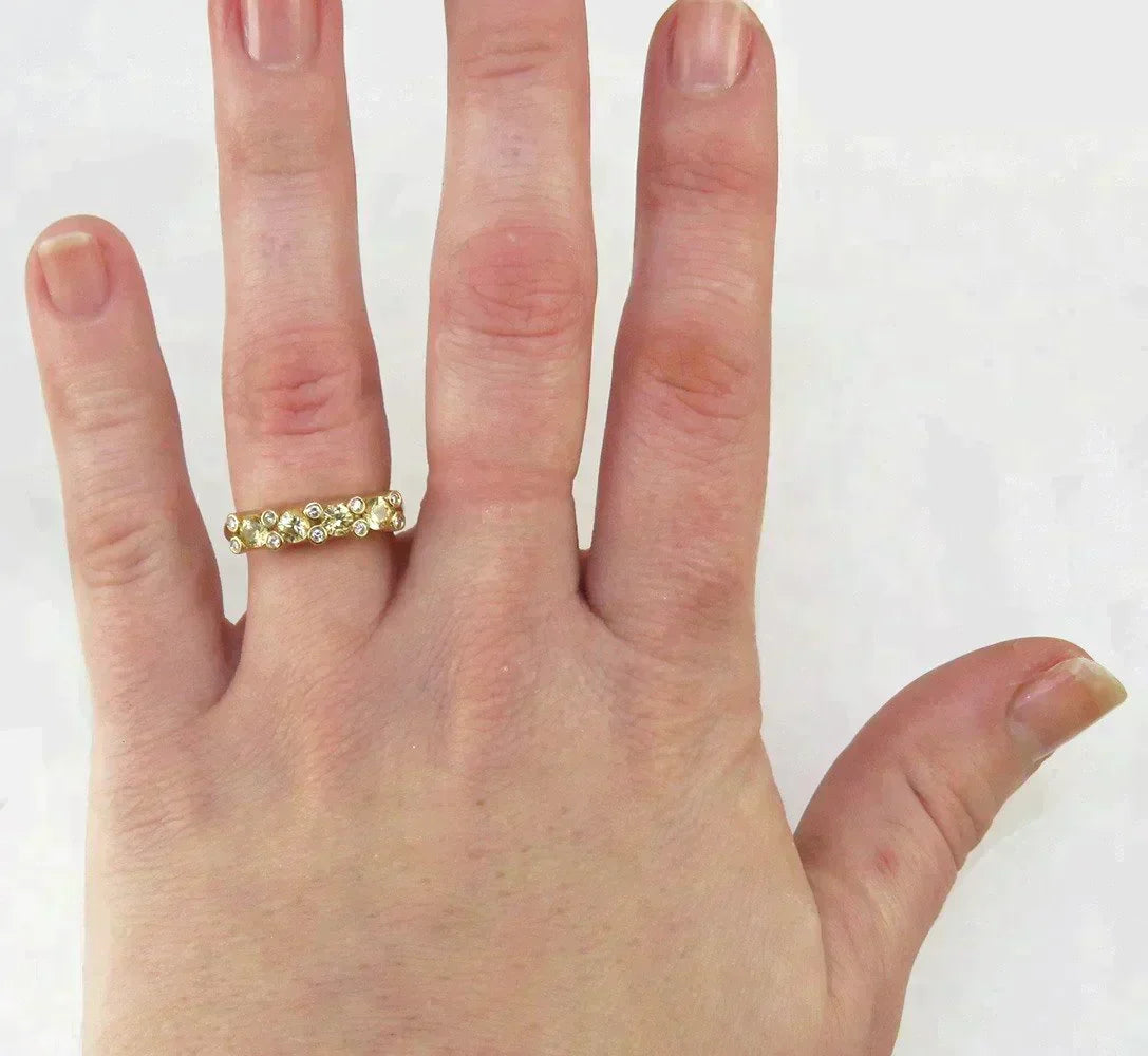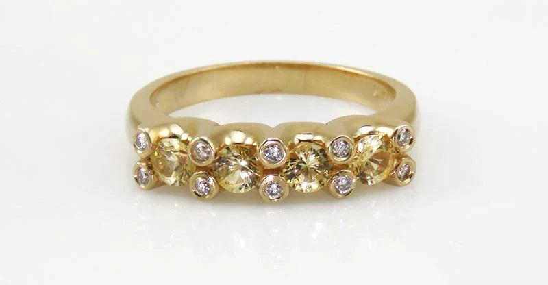 Presented is a gorgeous, 14 karat yellow gold, yellow sapphire gemstone and diamond ring. This ring is a size 7 and it can be resized by a professional jeweler. The top is securely prong set with 4 sparkling, yellow sapphires. There are 10 bezel set, modern brilliant cut diamonds in between the sapphires. There is approximately 15 points in total diamond weight and approximately 60 points in total sapphire weight.