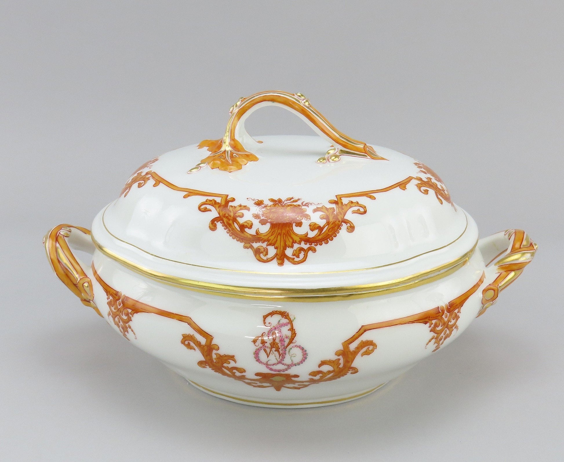 Presented is a fabulous French porcelain covered vegetable dish from the 1870s. This piece displays a gorgeous orange and gold pattern with classic French scroll and leafy details around the base and lid of the piece. The handles shows an interesting interwoven design. The design seemed to have an applied darker orange border with the light orange being hand painted. On both sides of the base of the dish, there is a stylized monogram, a W and T, interwoven, made up of the orange style decorations and pink roses to make up the letters.