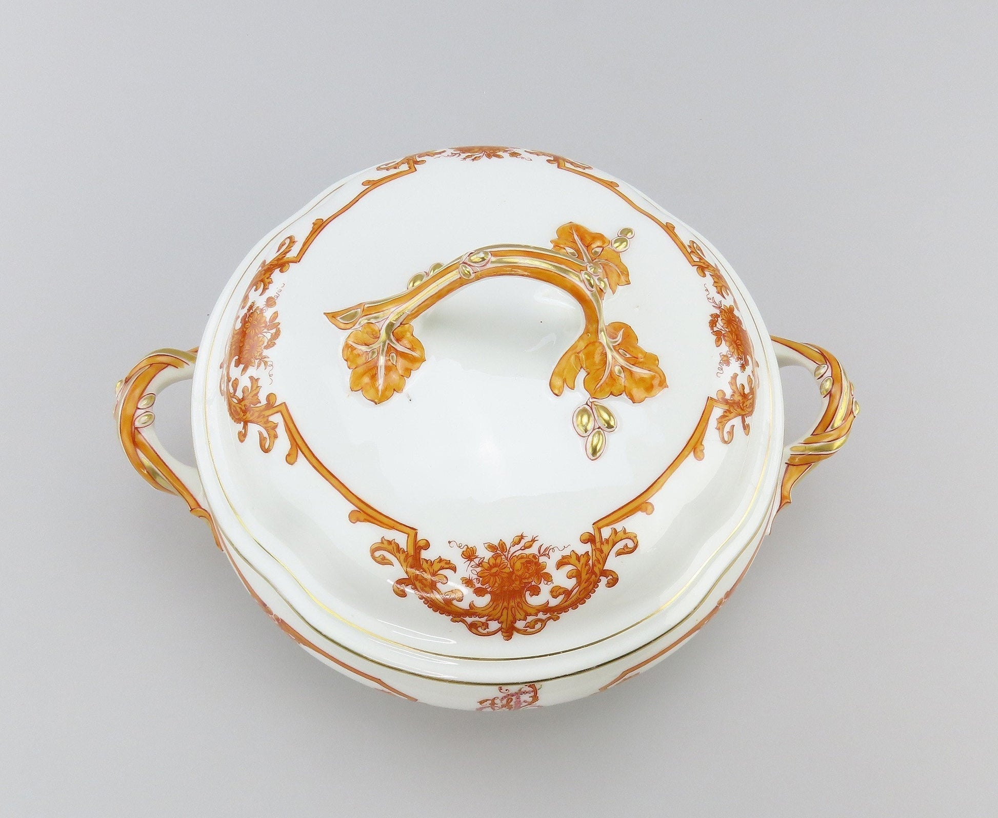 The covered dish is in great overall condition, especially considering age. The pattern details and the gilding are in great shape with minimal wear. There are no breaks or chips in the porcelain, and no repairs.