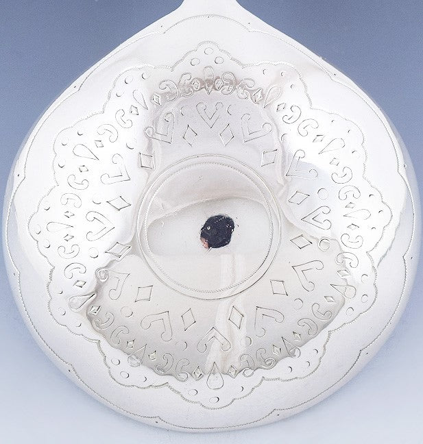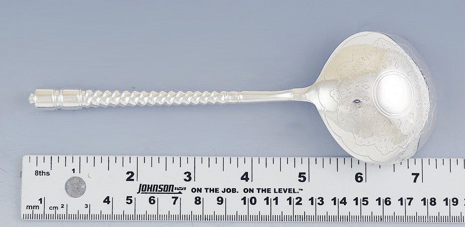 Presented is a fabulous Russian silver serving spoon. This piece was made in 1881. The back of the bowl of the spoon is beautifully hand engraved with an attractive design, while the handle is done in a spiral twist form. This is a well made piece, with a nice feeling of weight in the hand.