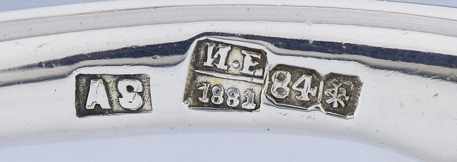 The spoon is hallmarked with the Russian city mark for St. Petersburg, the assay mark of master Ivan Vonifatiyevich Yevstigneyev, dated 1881, the 84 zolotniki mark guaranteeing 875 purity silver, and the maker's mark AS possibly for Alexander Stockberg.