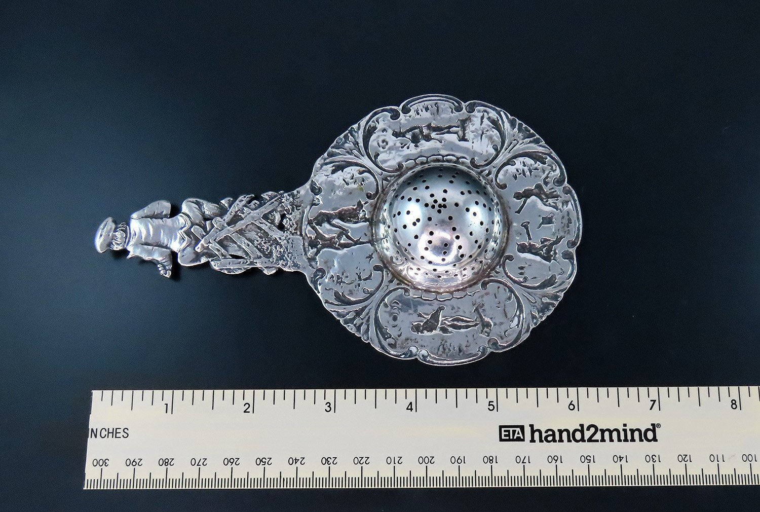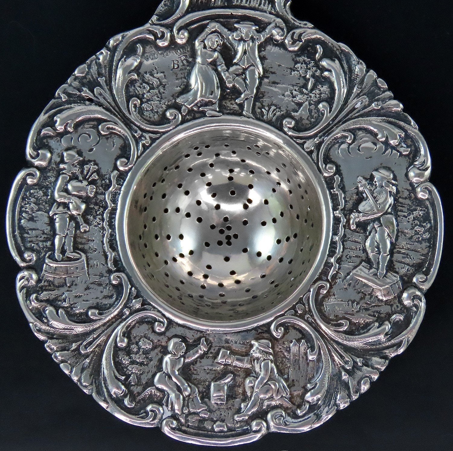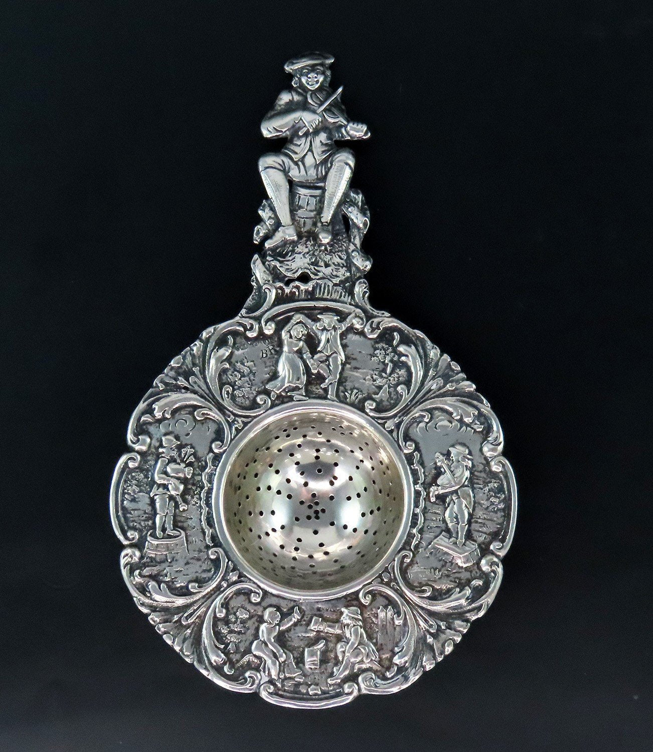 Fabulous Antique German 800 Silver Tavern Genre Scene Fiddler Tea Strainer