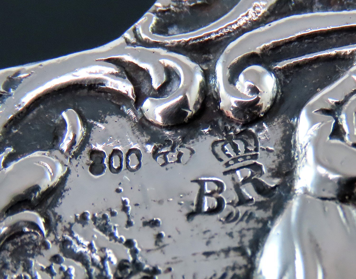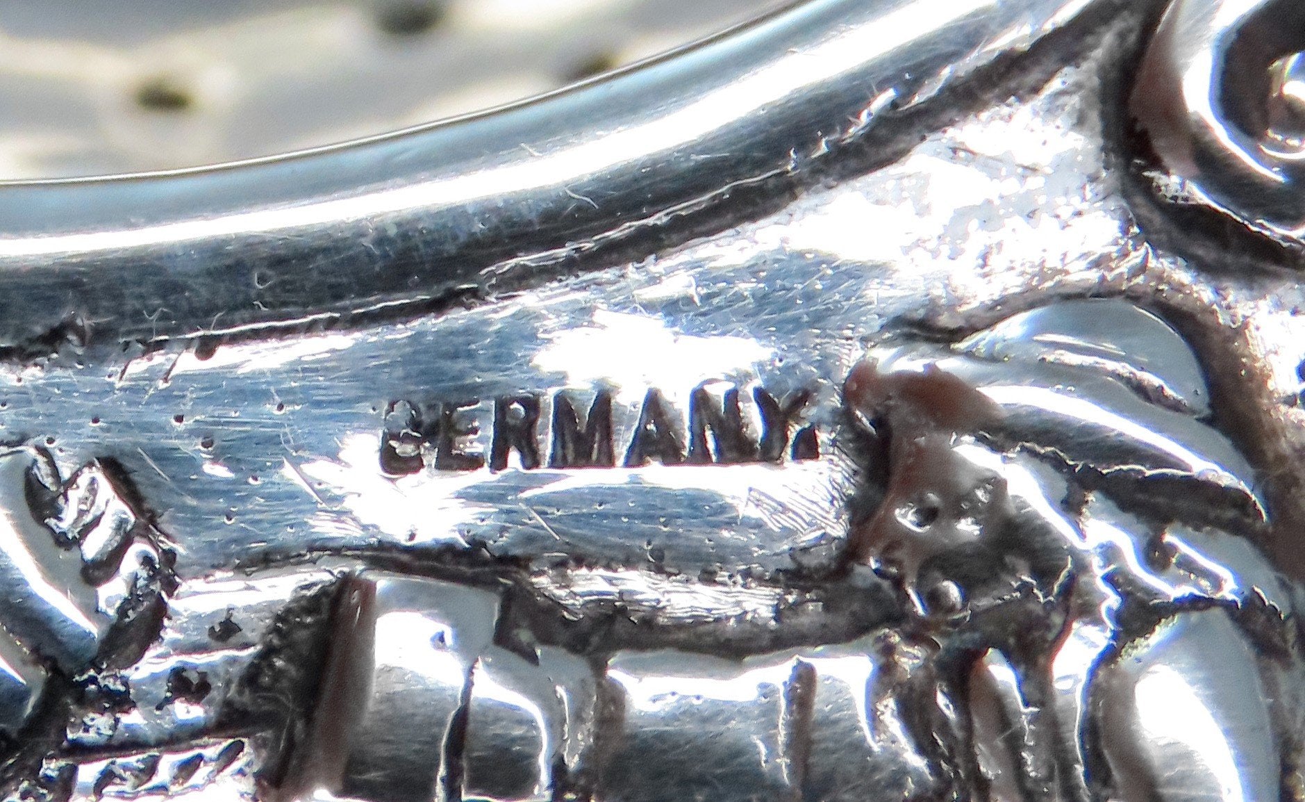 The strainer is stamped Germany, as well as the German crescent and crown mark including 800 for the purity of the silver and some Hanau style pseudo-hallmarks.