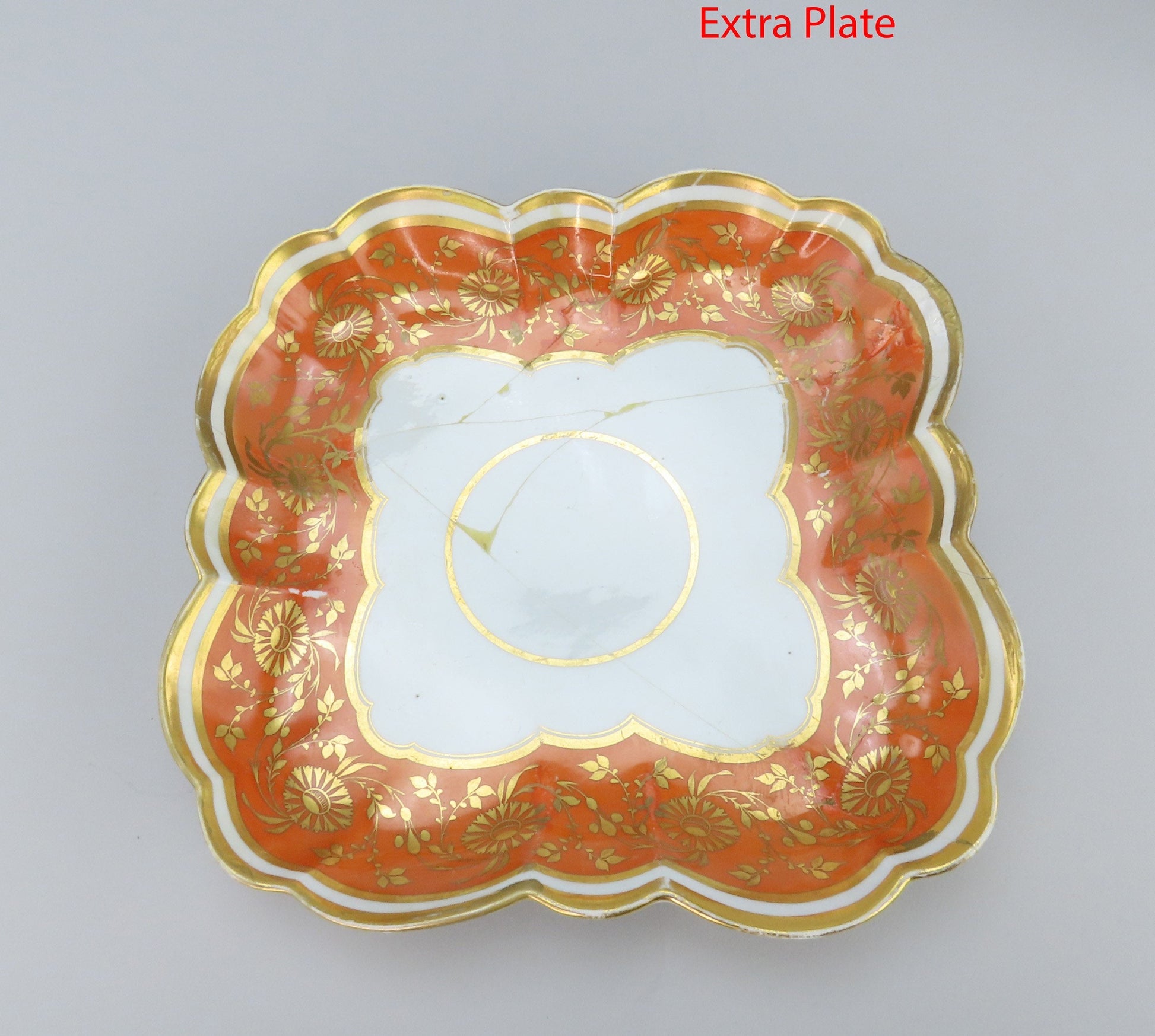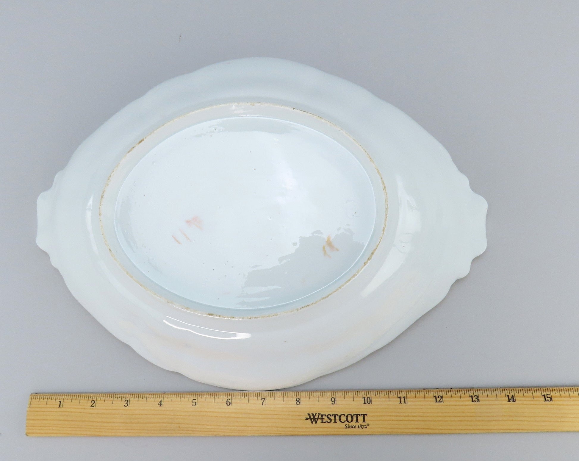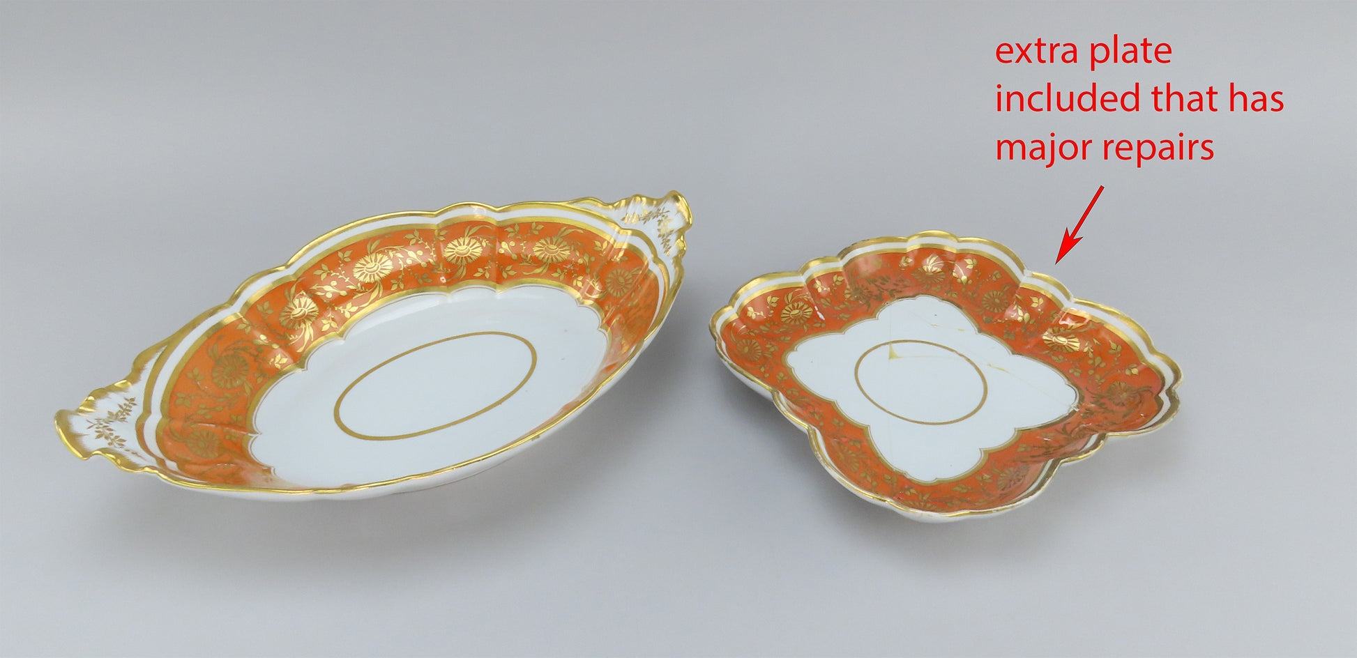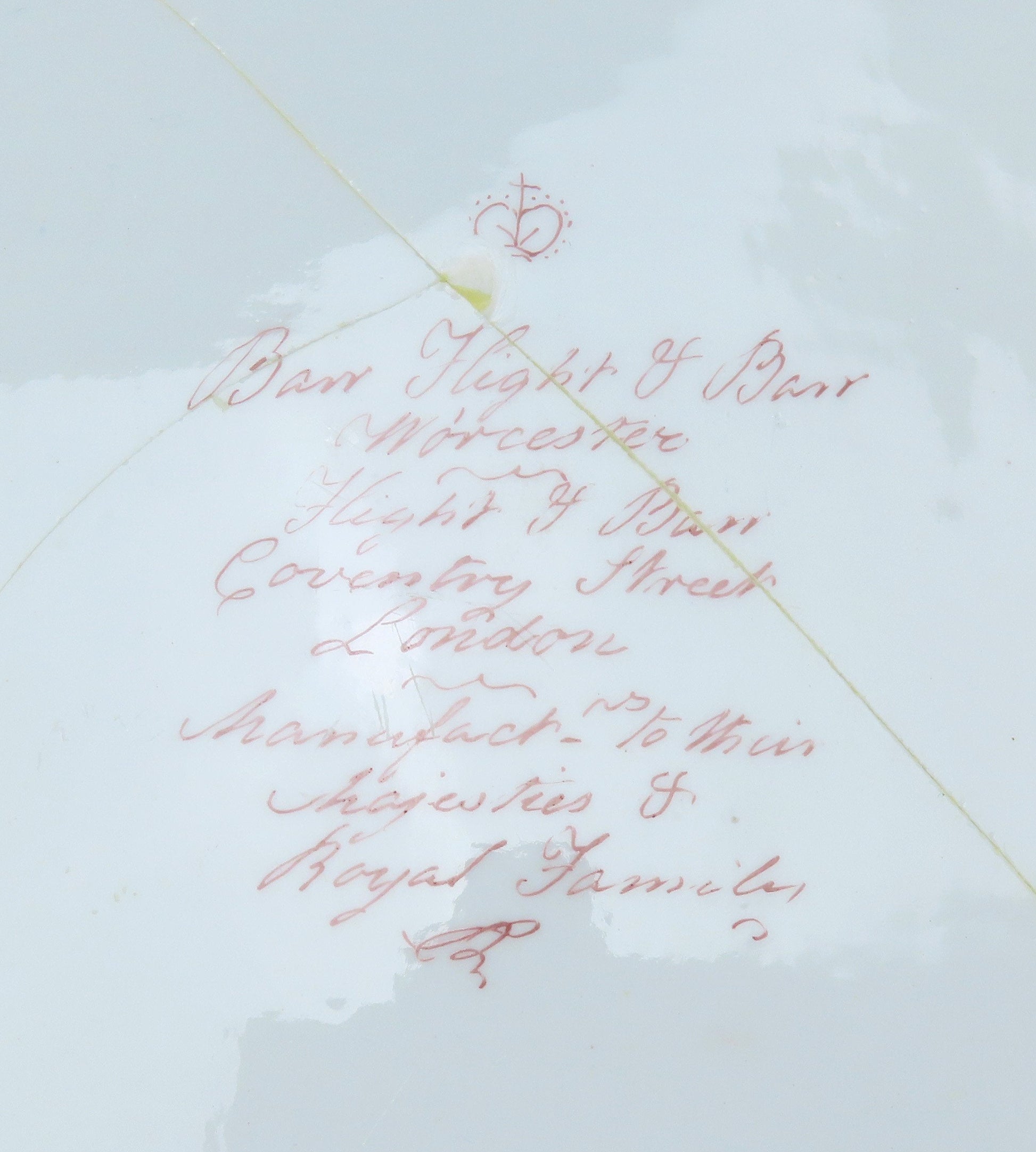 This piece comes with a free quatrefoil square server which has been heavily repaired. The piece, however, displays a hand-done mark from Barr, Flight, and Barr that the server does not have. The mark reads: “Barr, Flight & Barr Worcester / Flight & Barr Coventry Street, London / Manufacturers to their Majesties & Royal Family”. If you do not want this free piece, please let us know and we will not send it to you. The underside of the large oval server has been marked under the glaze with a B for Barr, Flight, and Barr.