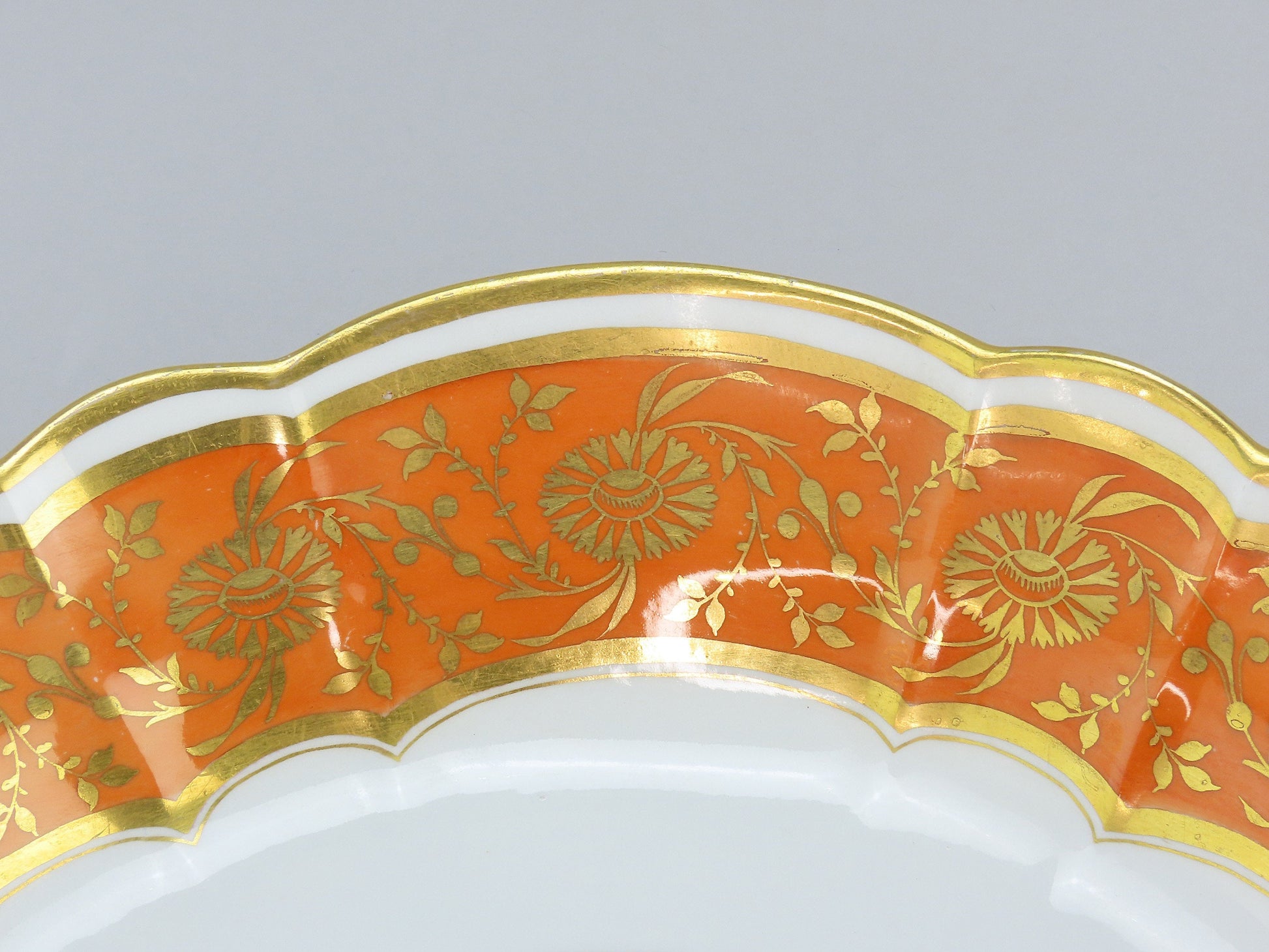 Presented is a fabulous large oval serving dish from Barr, Flight, and Barr. This piece was likely produced between 1807-1813. The pattern displays a bright orange wide border with gilded flowers and leaves. At either end is a handle with decorative scalloped edging and sprigs of gilt flowers. Please note, we have other groups of plates and serving pieces by Barr Flight Barr in the same pattern, which you can find for sale in our storefront by searching Barr Flight Barr.