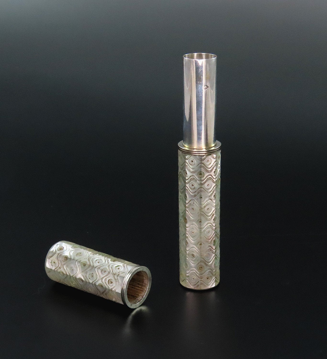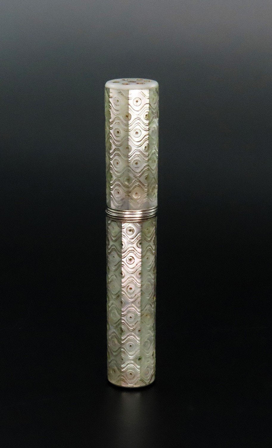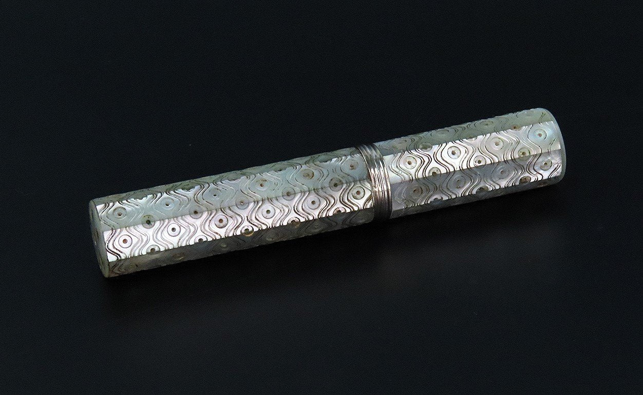 Presented is a fabulous mother of pearl cylindrical case, likely French, Swiss or Austrian. The piece, likely made between 1820-1870s, displays great engravings along the mother of pearl. The interior of the case is completely silver. This case was likely used for holding needles and used in sewing-related crafts, but you could use this for whatever you like.