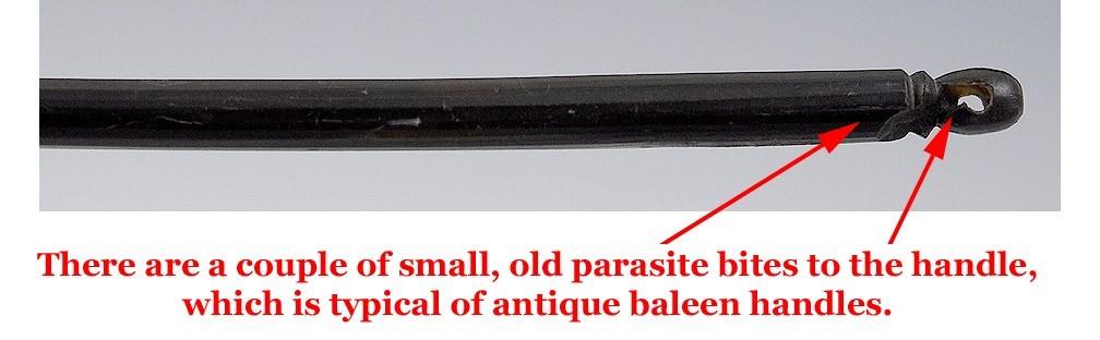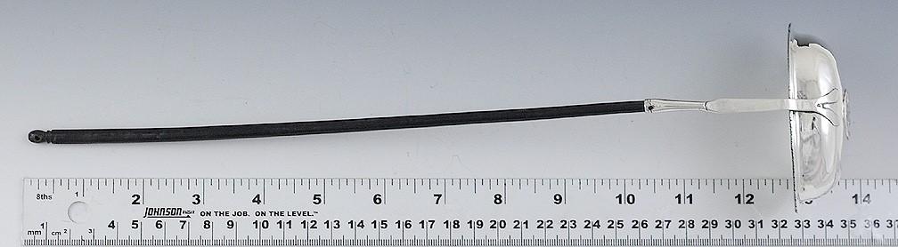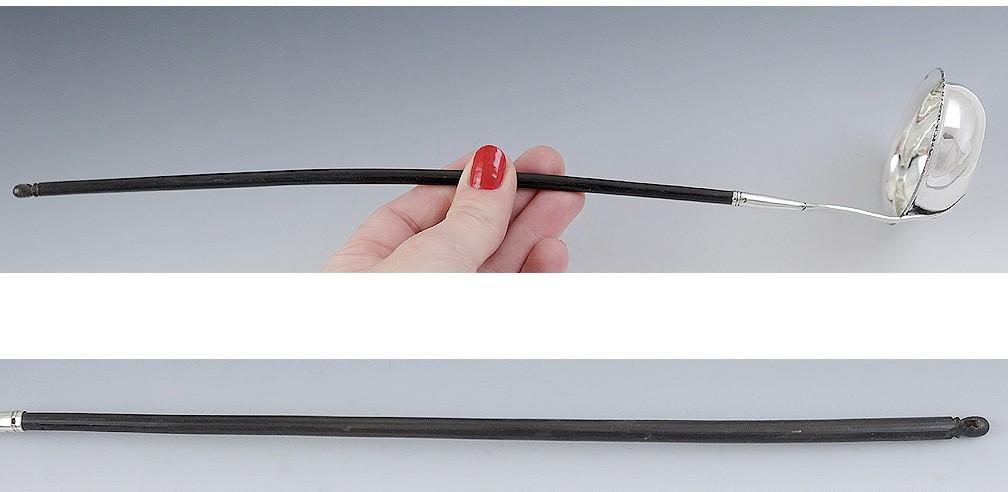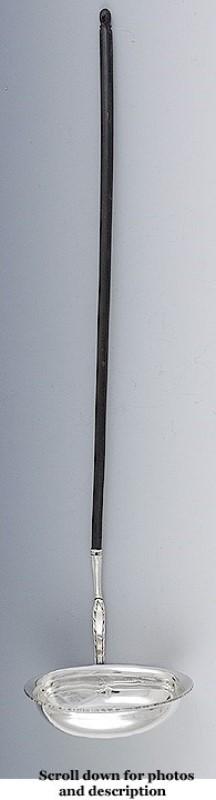The ladle is in great overall condition. The baleen handle has some damage to one end, which is typical of baleen handles, and the handle has been remounted at some point. The silver is in excellent condition, with no splits, no breaks, no monograms, and no repairs.