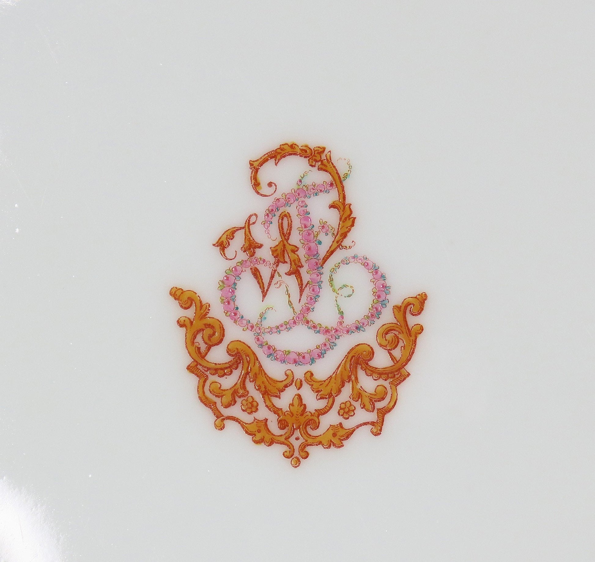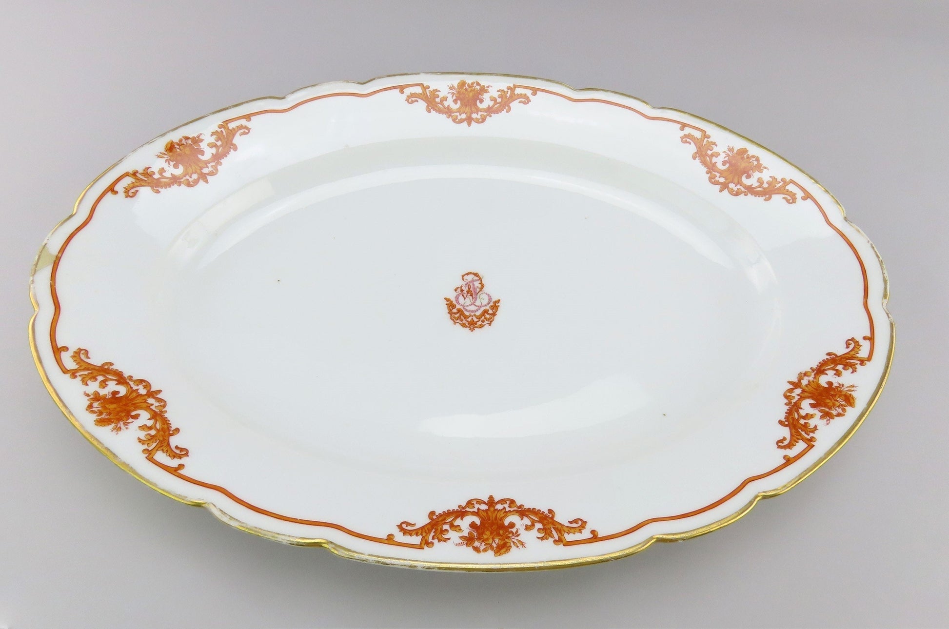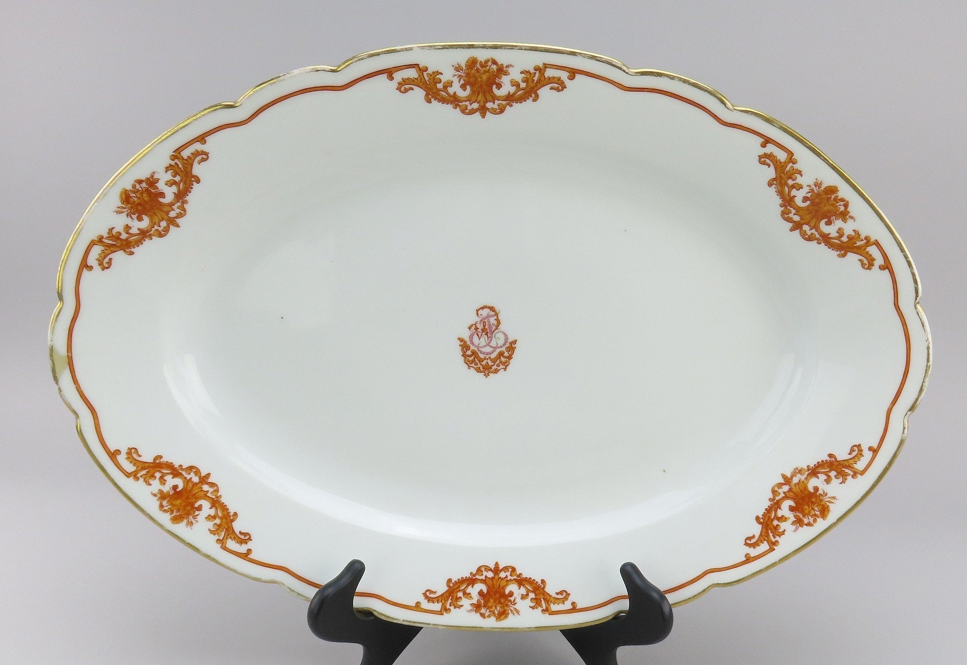 Presented is a fabulous large French porcelain tray from 1870s. The piece displays a gorgeous orange pattern with classic French scroll and leafy details around border with a gold edge. The design seemed to have an applied darker orange border with the light orange being hand painted. There is a stylized monogram at the center at each bowl, a W and T, interwoven, made up of the orange style decorations and pink roses to make up the letters.