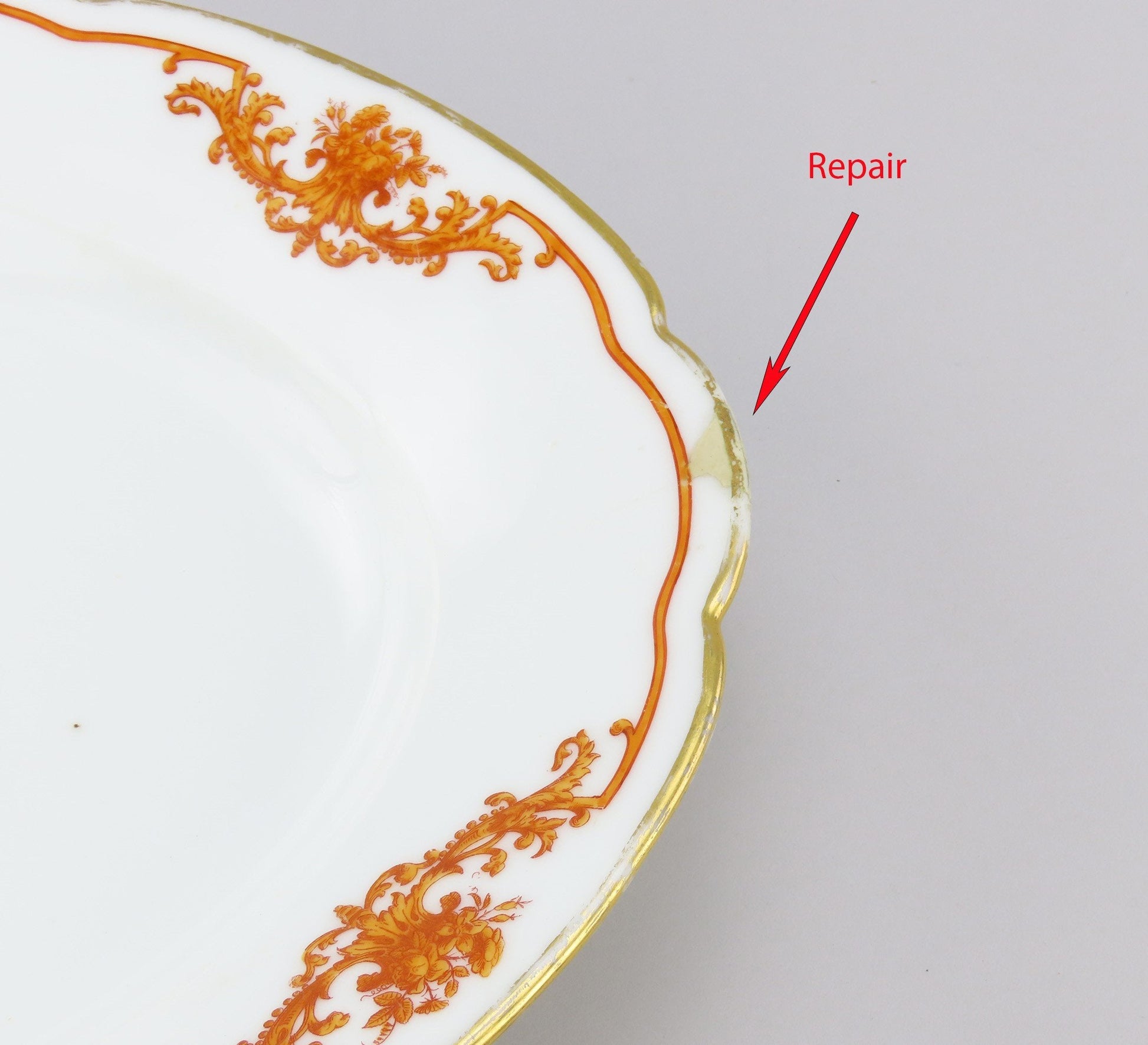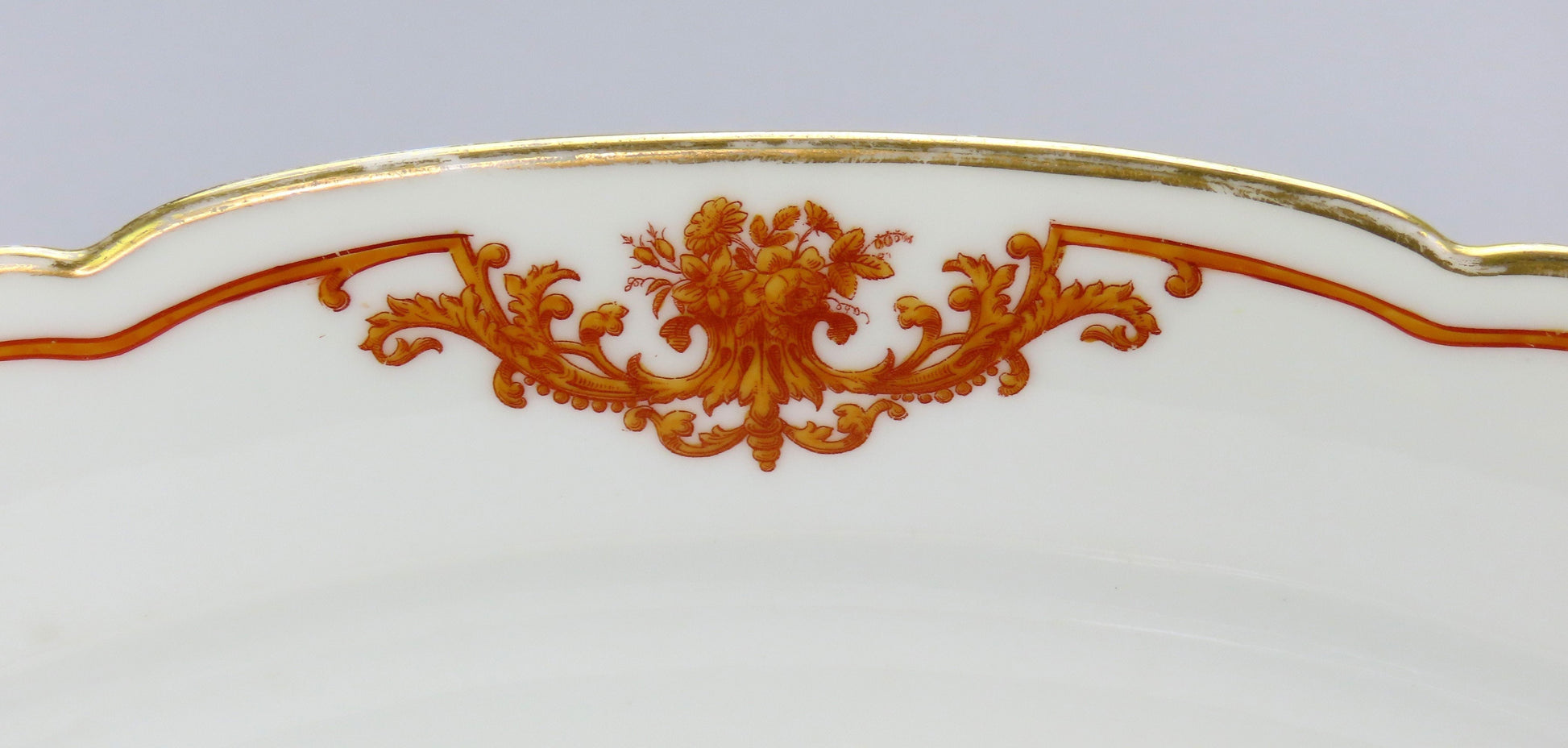 The tray is in good overall condition. As seen in the photos, there is a small repairs/ fill-in on the left edge of the tray. The gilded border is in good shape, with only some wear. The orange border decorations are in great shape and well-defined. There are no breaks or chips in the porcelain, and no other repairs.