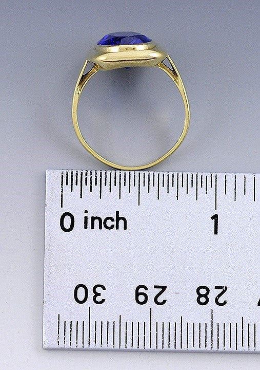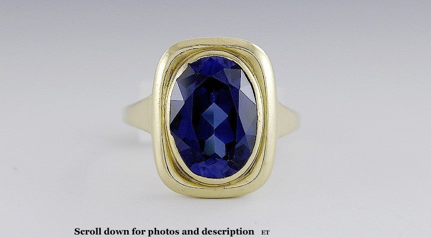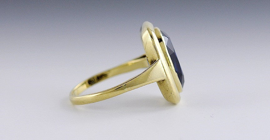 Presented is a fantastic quality 18K gold and synthetic sapphire ring. The oval synthetic sapphire is securely bezel set in a simple, square 18K gold setting. The synthetic sapphire has fantastic color and clarity, and it is lab created. The sapphire measures about 13.31 by 10.2 millimeters and 5.72 millimeters deep, and is a minimum of 6.02 carats, possibly as high as 6.26 or 6.5 carats. A great, high end looking piece for a fraction of the cost. This was likely made in Europe in the past 30 or 40 years.