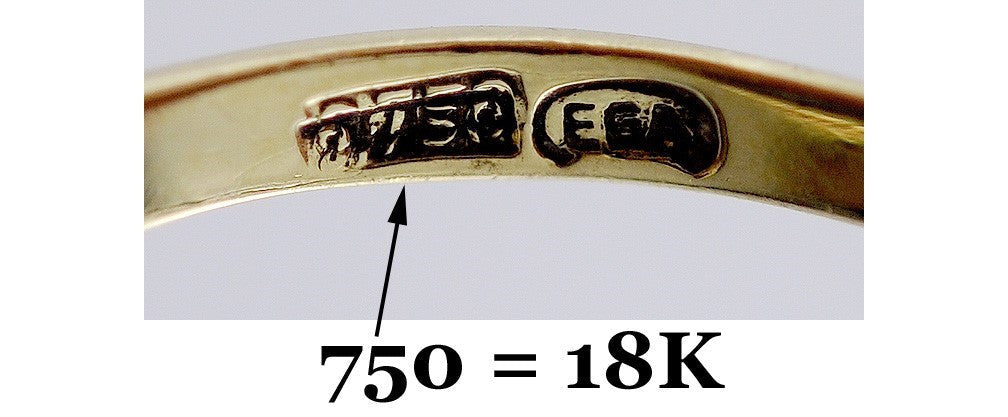 The ring is marked on the inside of the band with 750 for 18K gold, and EGA for the maker. The 750 stamp is double struck. We have tested it with nitric acid and guarantee it to be 18K gold.