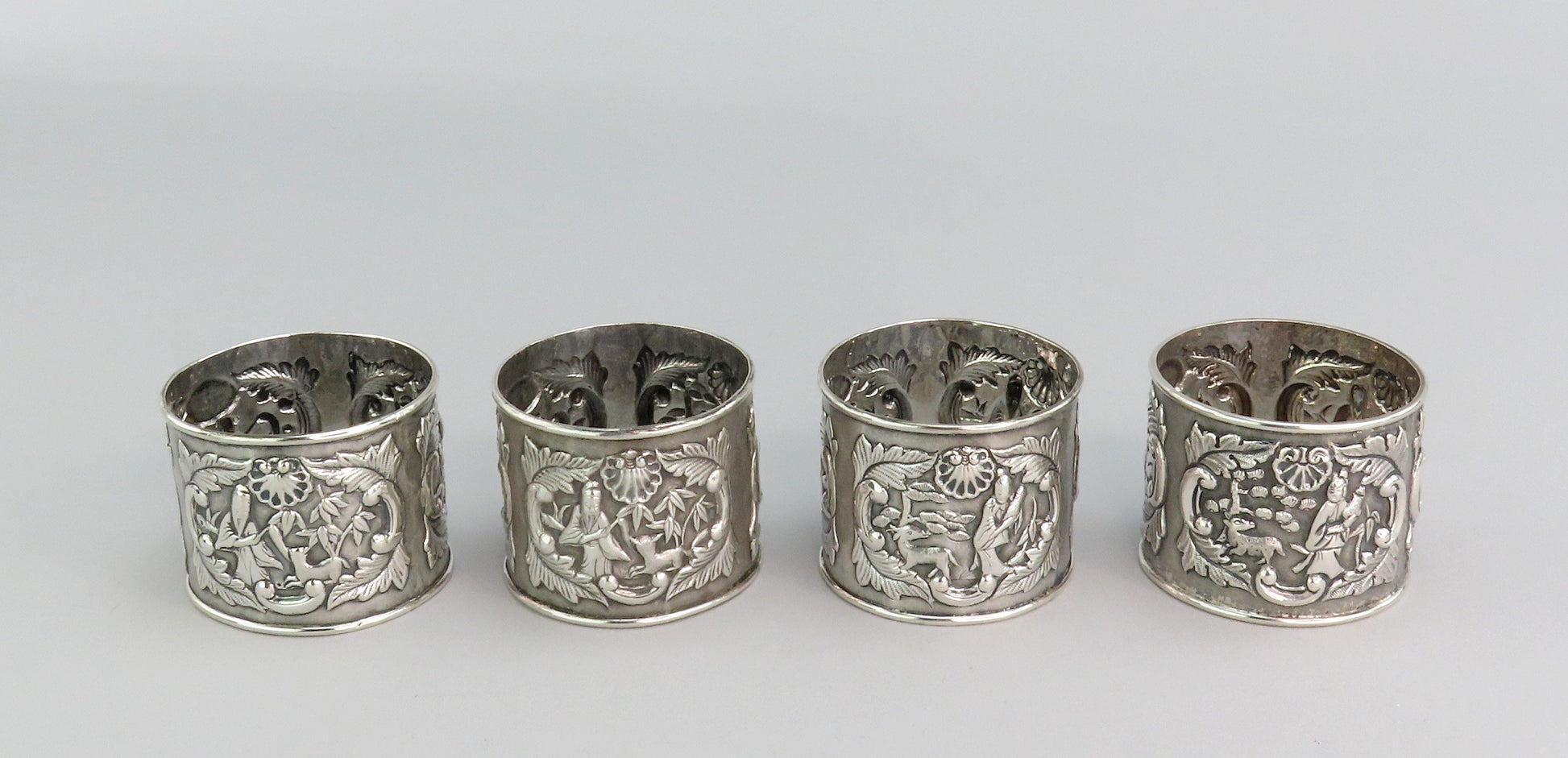 Presented is a fabulous set of 4 Chinese export silver napkin rings in the original box. The set is from the mid-1800s, circa 1845 to 1870s. The silver napkin rings displays 3 hand-chased genre scenes of men with a deer surrounded by trees. One scene has a small oval cartouche above it with no monograms.