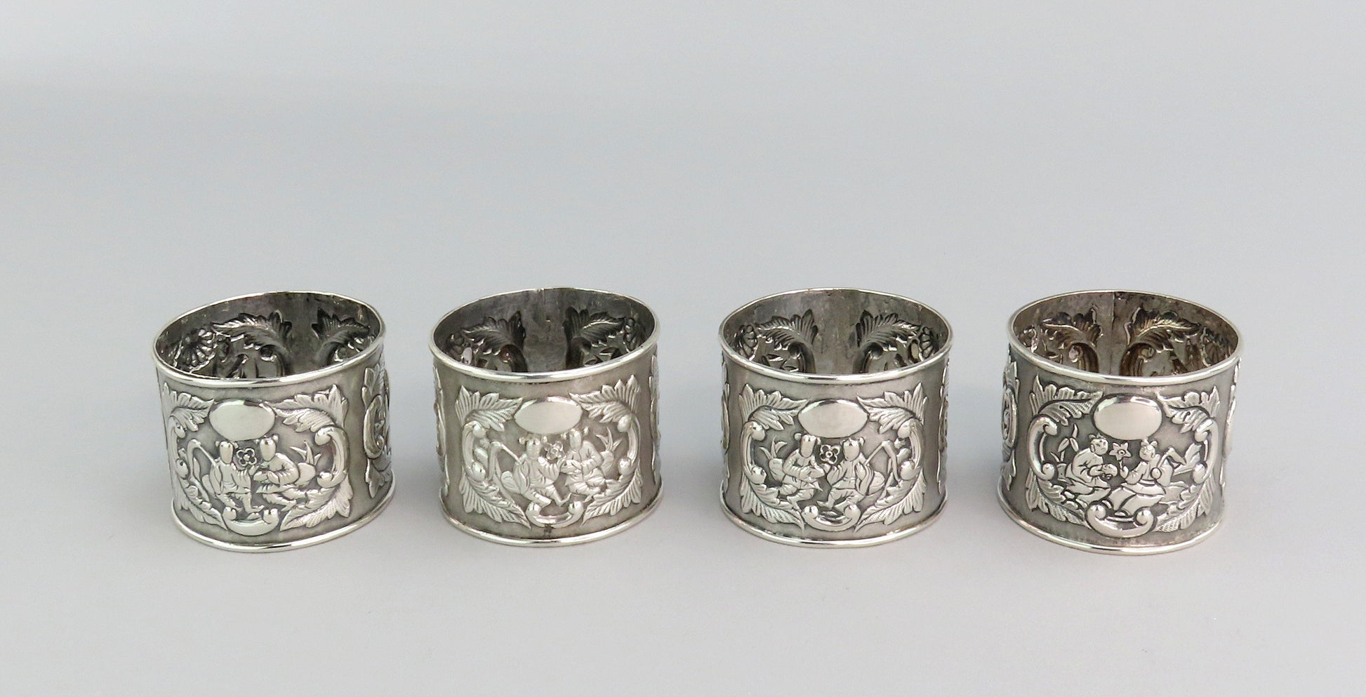 Fabulous Set Chinese Export Mid-1800s Silver Napkin Rings w/ Original Box