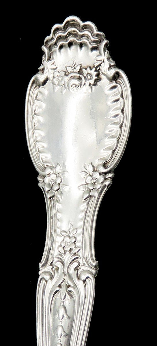 Presented is an fabulous large sterling silver fish serving fork from Tiffany & Co. This piece is in the Richelieu pattern, which was patented in 1892. The pattern displays lots of floral and shell details along the front and back of the handle.