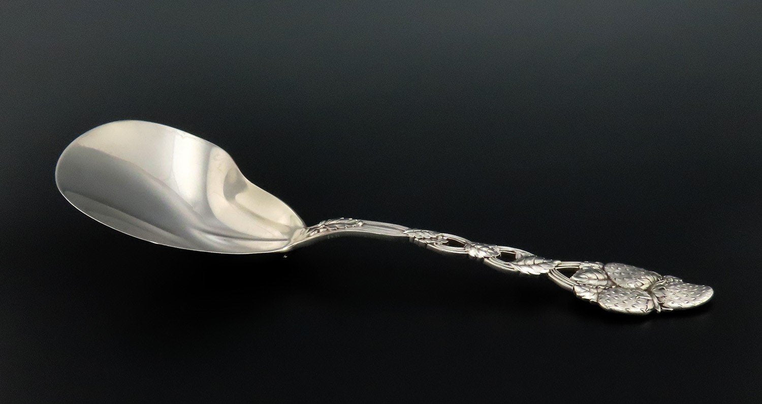 Presented is a fabulous Tiffany & Co sterling silver serving spoon. This piece is made in the beautiful Strawberry pattern, and dates to around the 1890s. As the name suggests, this pattern features a finely detailed design of three strawberries on the end of the handle. The bowl of the server is done in an interesting sort of kidney or eggplant shape. Great for serving berries of course, but could easily be used for serving casseroles, mashed potatoes, or whatever else you like.