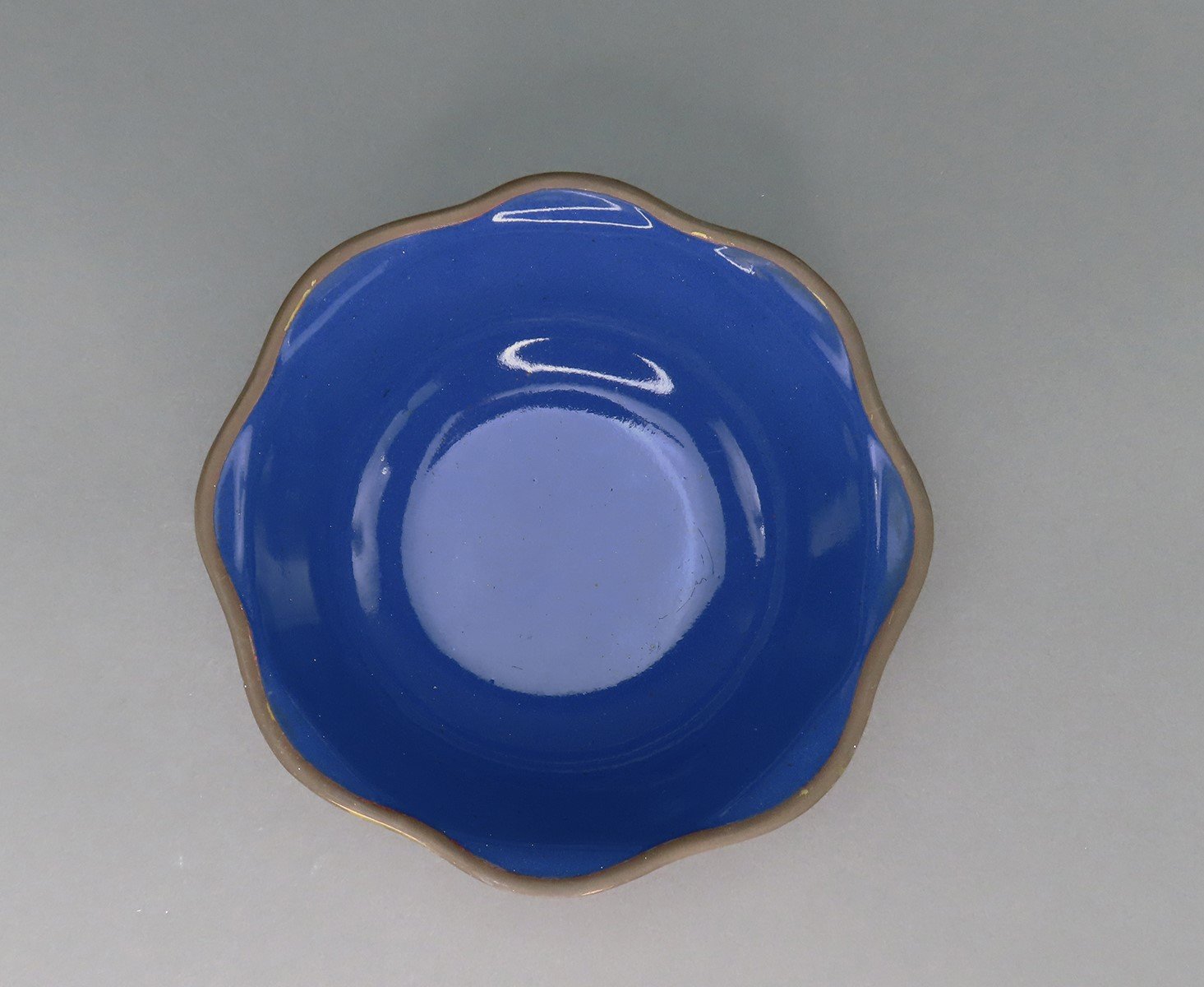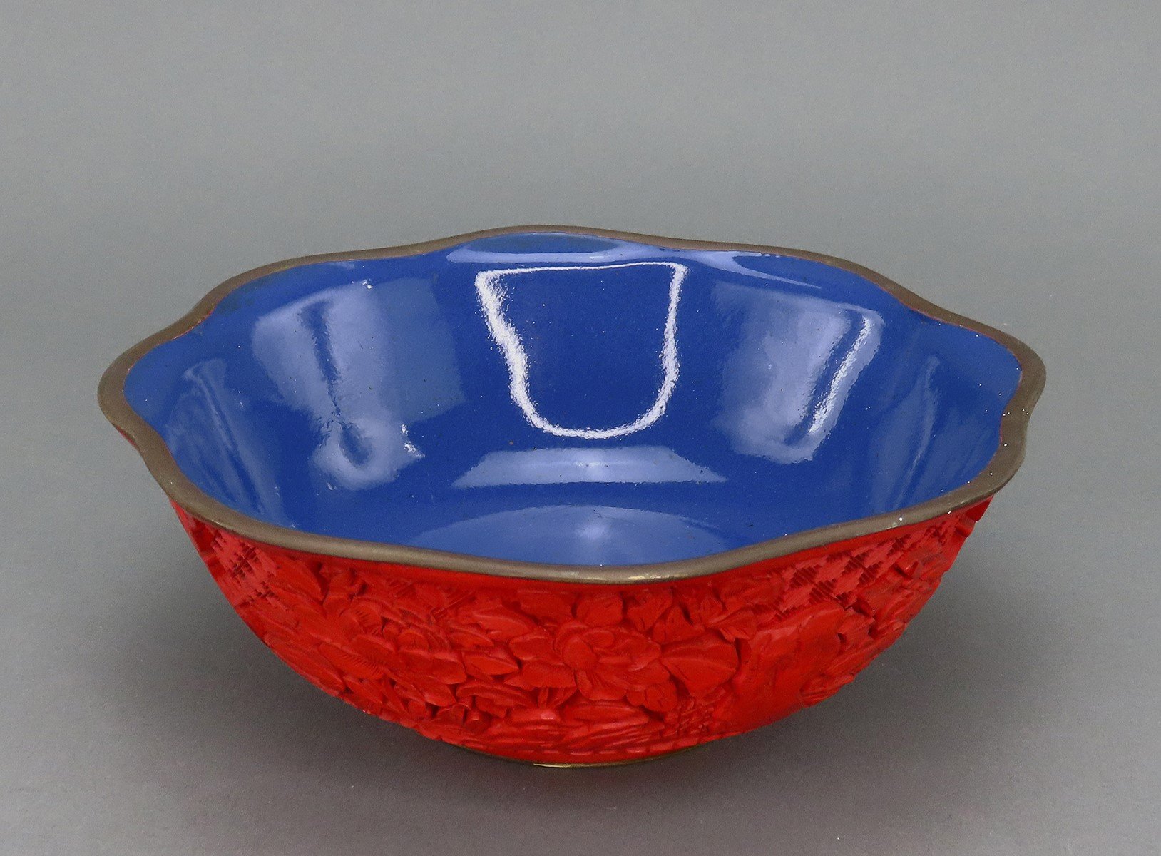 Fabulous VTG Hand Carved Chinese Cinnabar Floral Bowl Blue Enamel