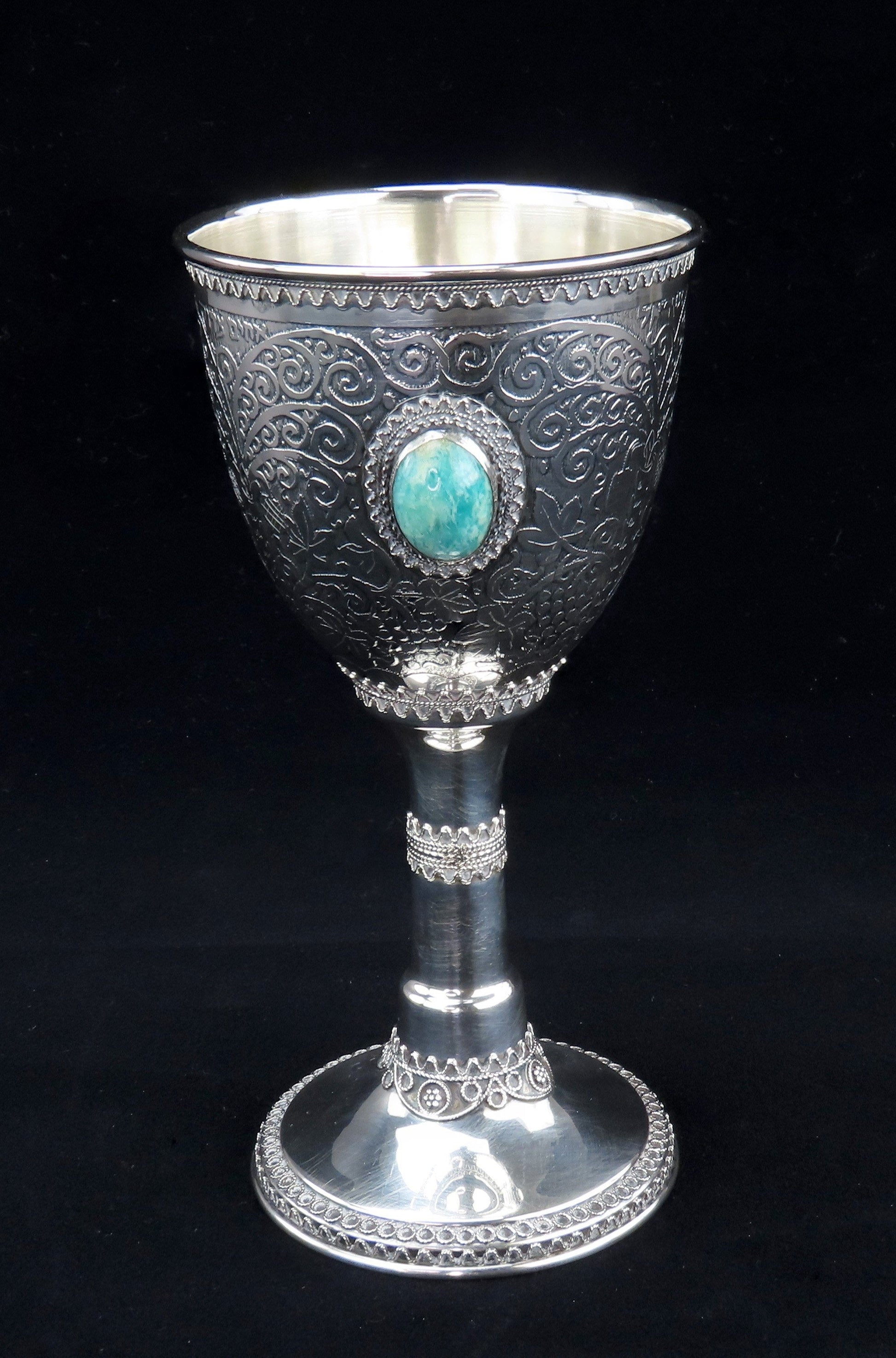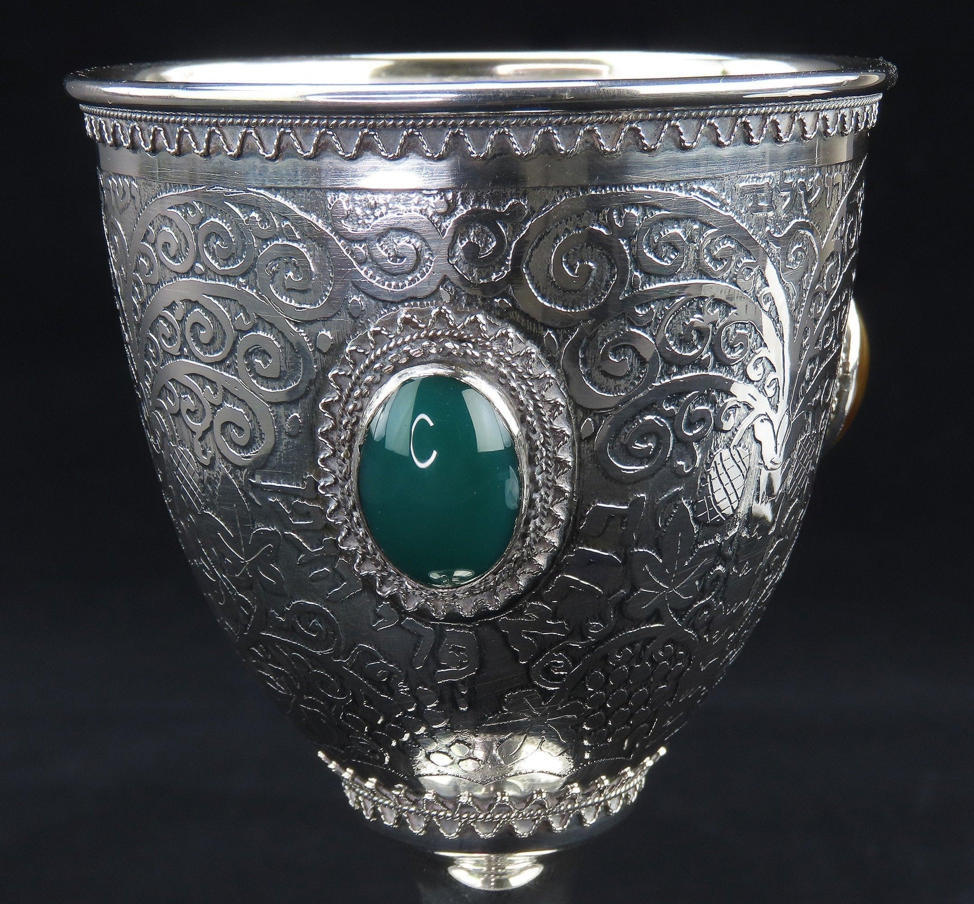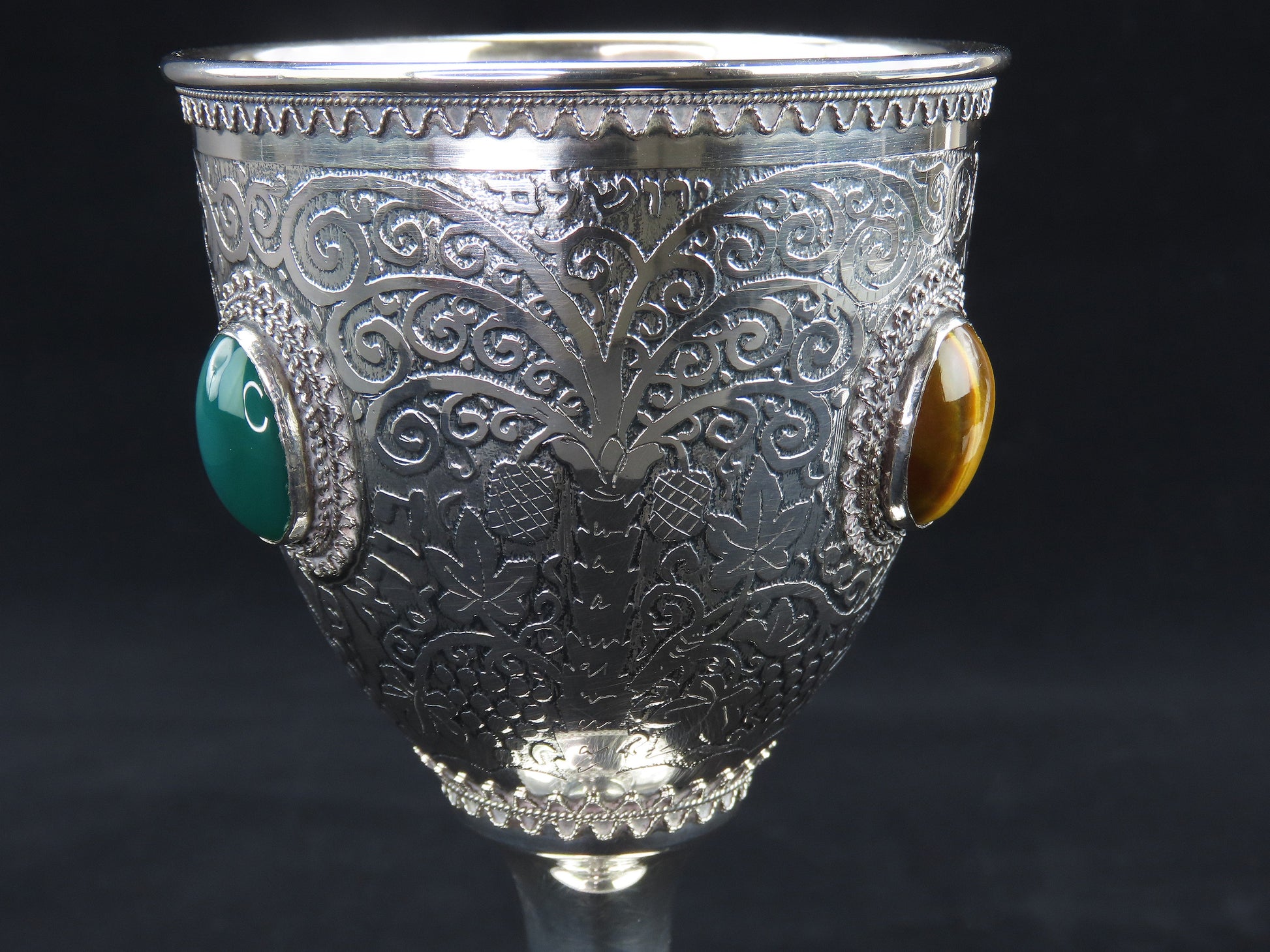 Presented is a fabulous modern kiddush cup from Israeli maker, Zadok. This piece displays three colorful stones with intricate wire decorations and engraved trees and vines. The interior has a light gold wash. There is Hebrew writing around the darker green stone and close to the rim at the top of the trees. This Hebrew displays the Jewish blessing of the wine.