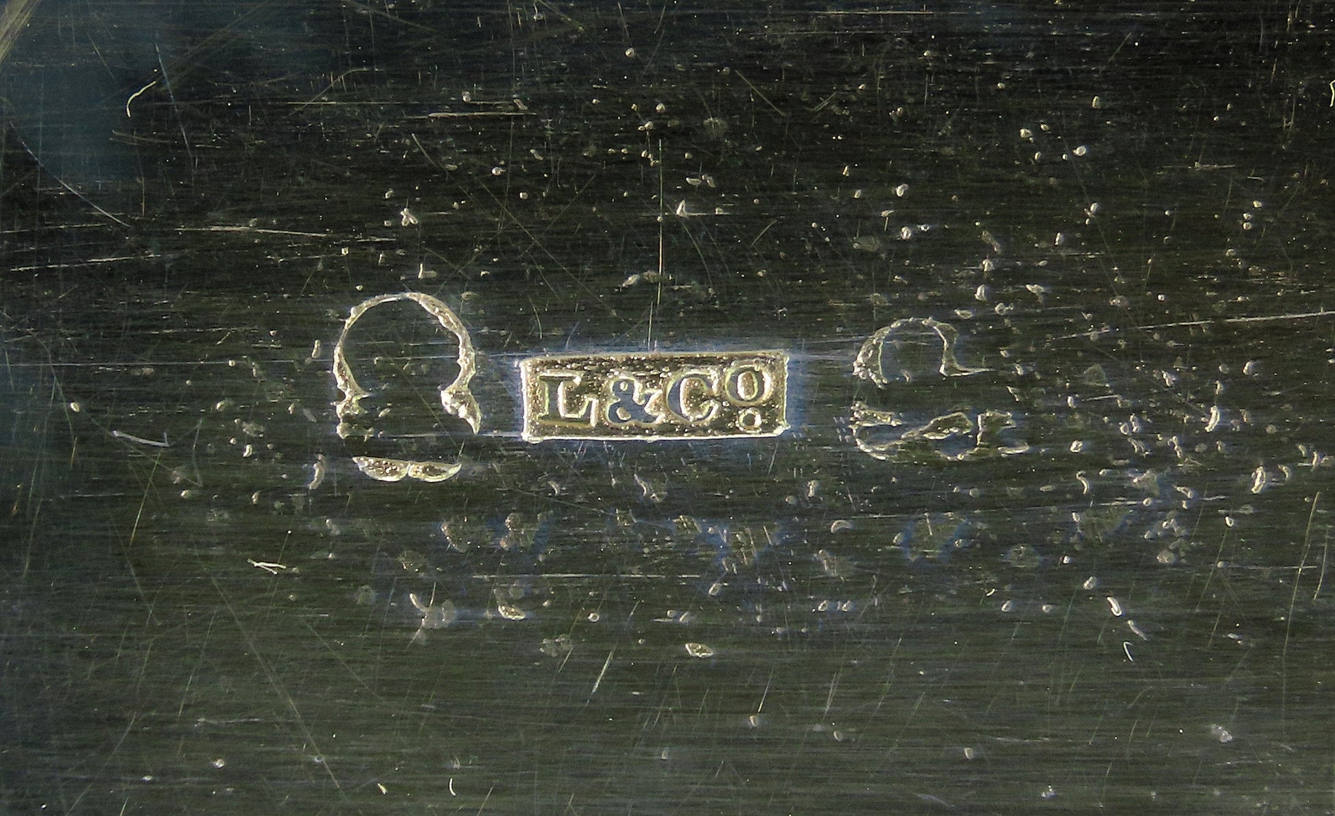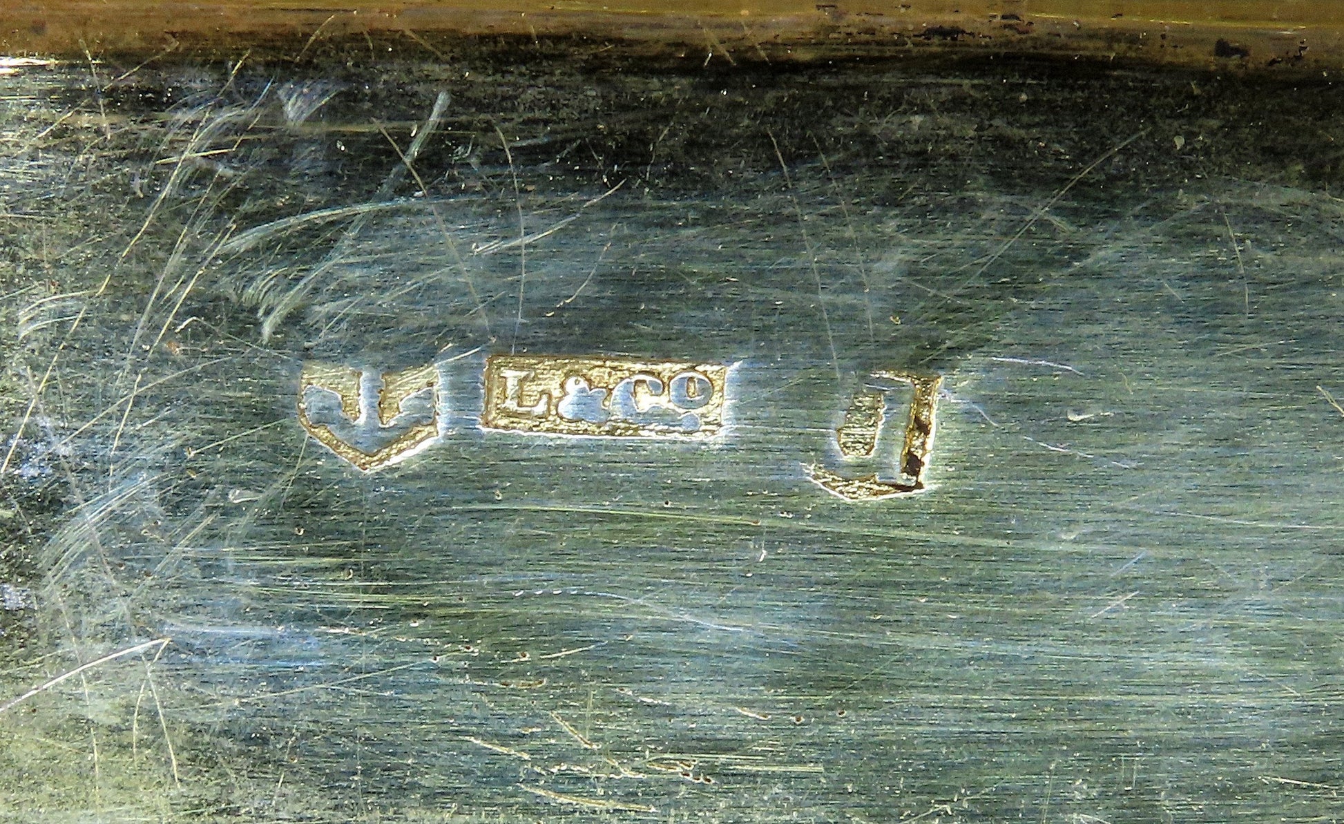 The inside of the vinaigrette box is marked with a lion passant mark indicating sterling silver, an anchor for the city of Birmingham, the duty mark of King George III's head, a date mark u for 1818 and the marker's mark L & Co for Lea & Co.