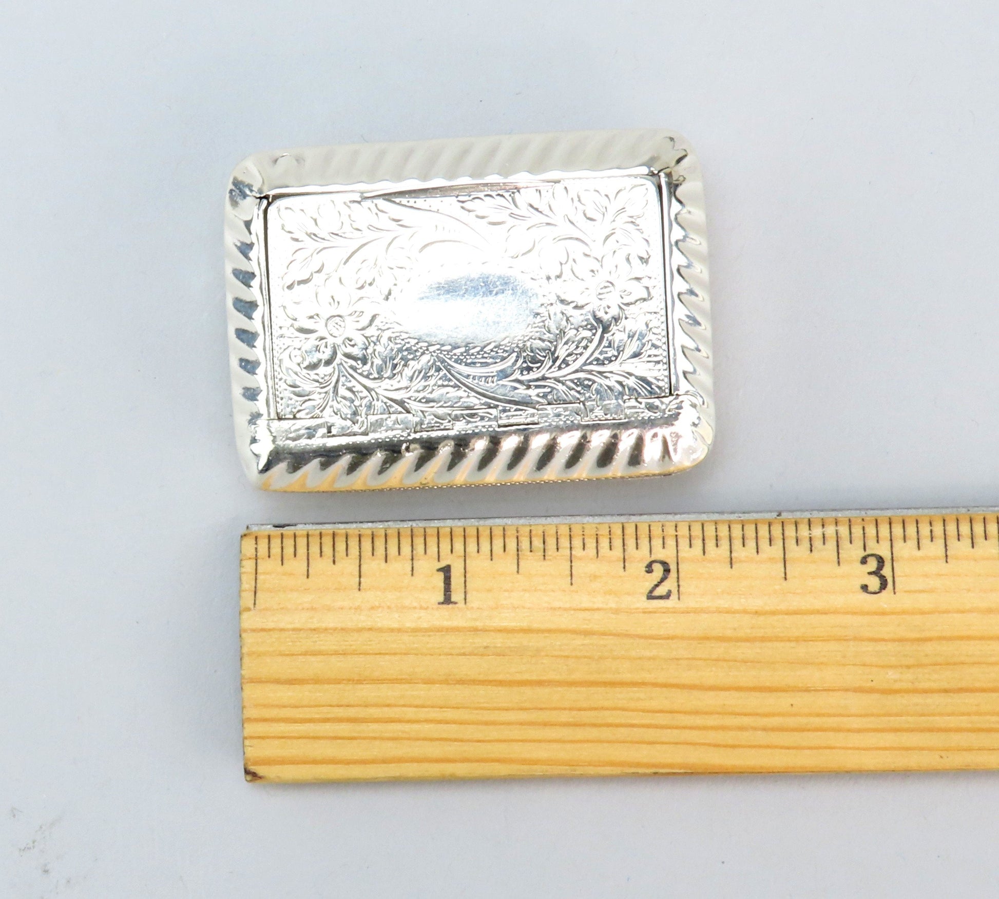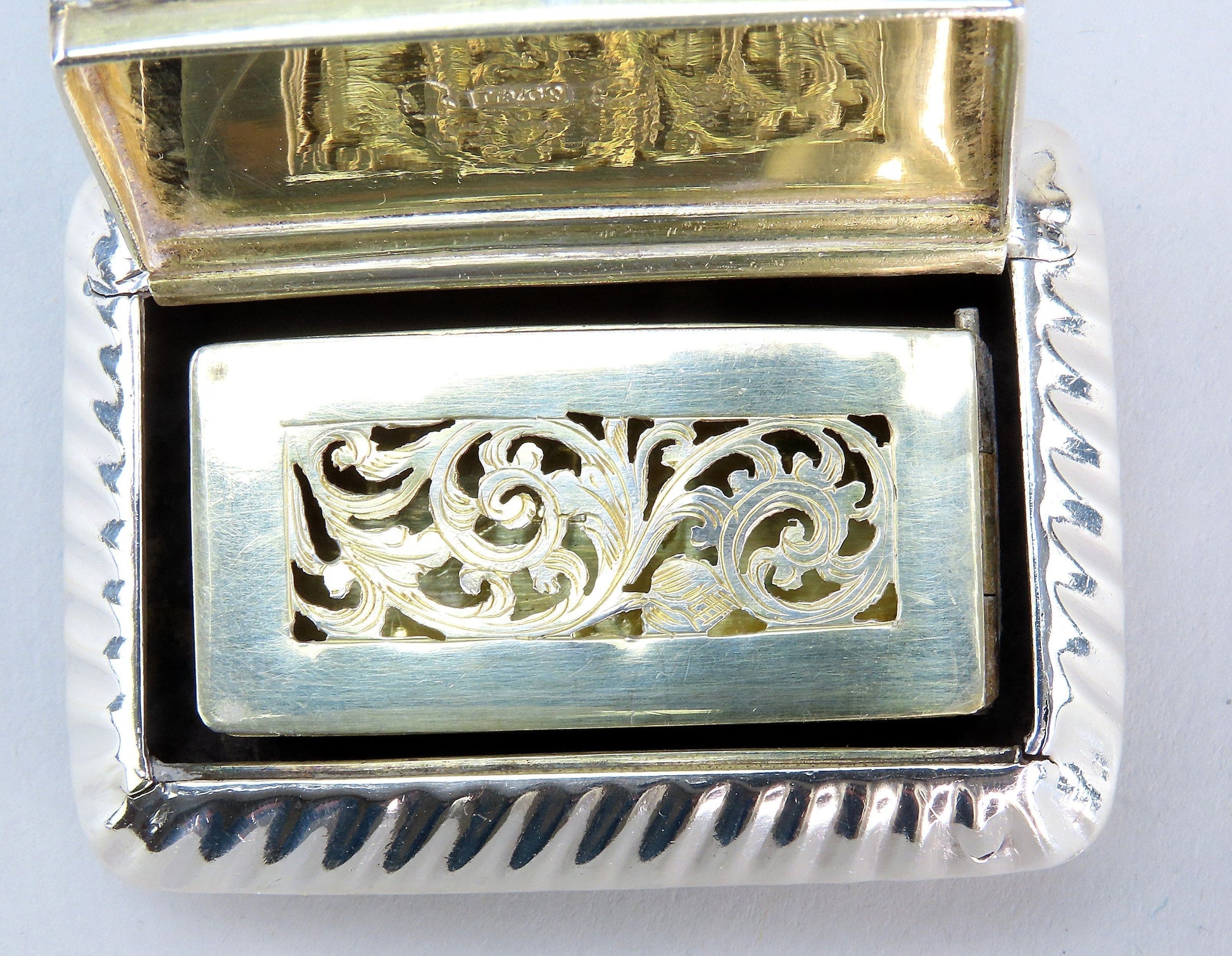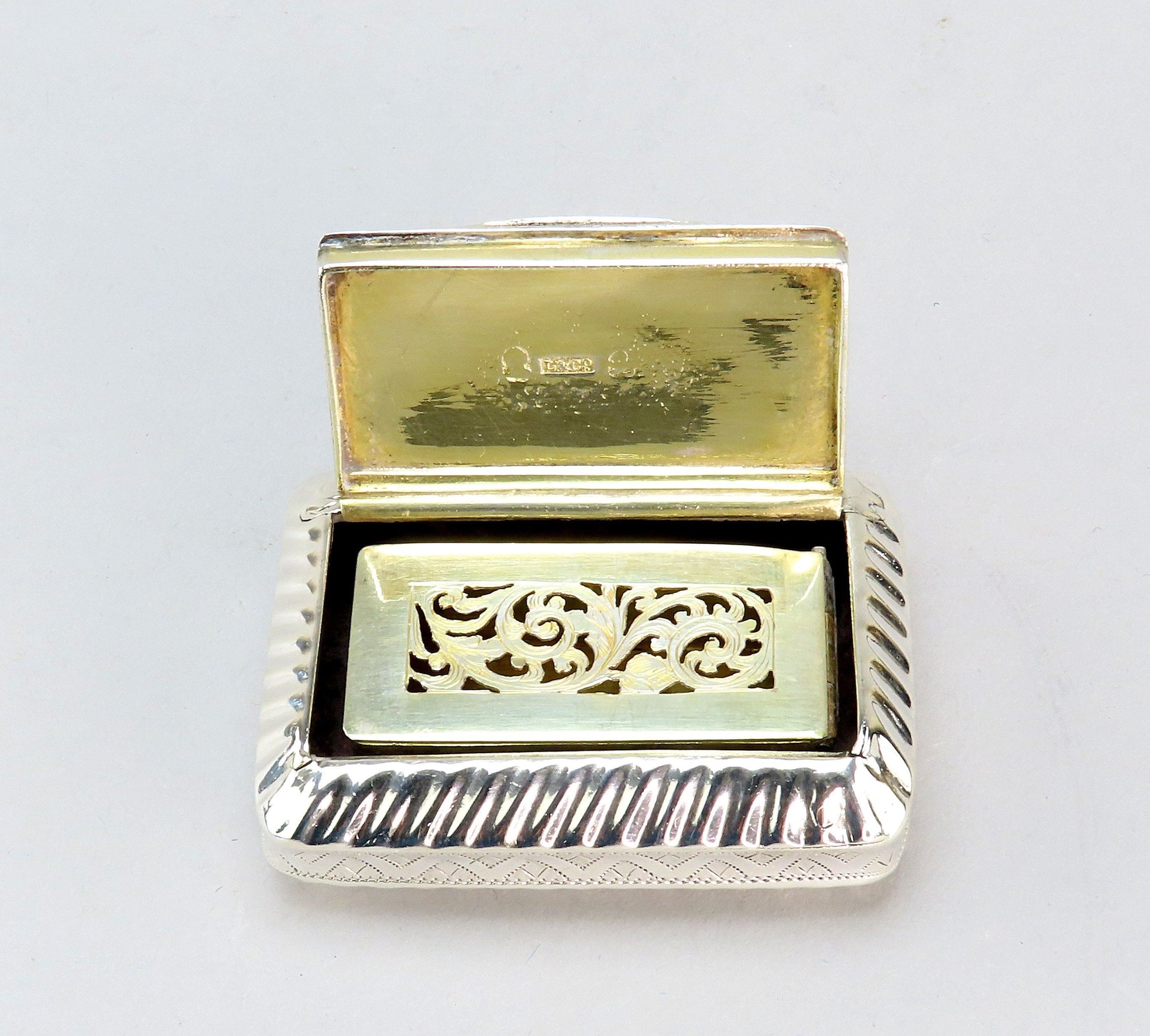 Presented is an antique, English sterling silver vinaigrette or scent box made in Birmingham in 1818. This piece has a very unusual design, a box within a box. The outside top lid and bottom are beautifully engraved. The sides are accented with crisp fluting. The inside grill of the scent box has a beautiful pierced design. The inside of the box and grill are all gold-washed. The hinge to the outside lid and the hinge to the inside grill to the scent box are in great working condition.