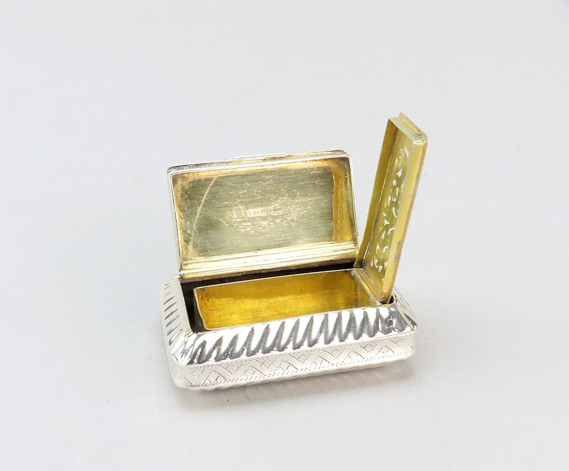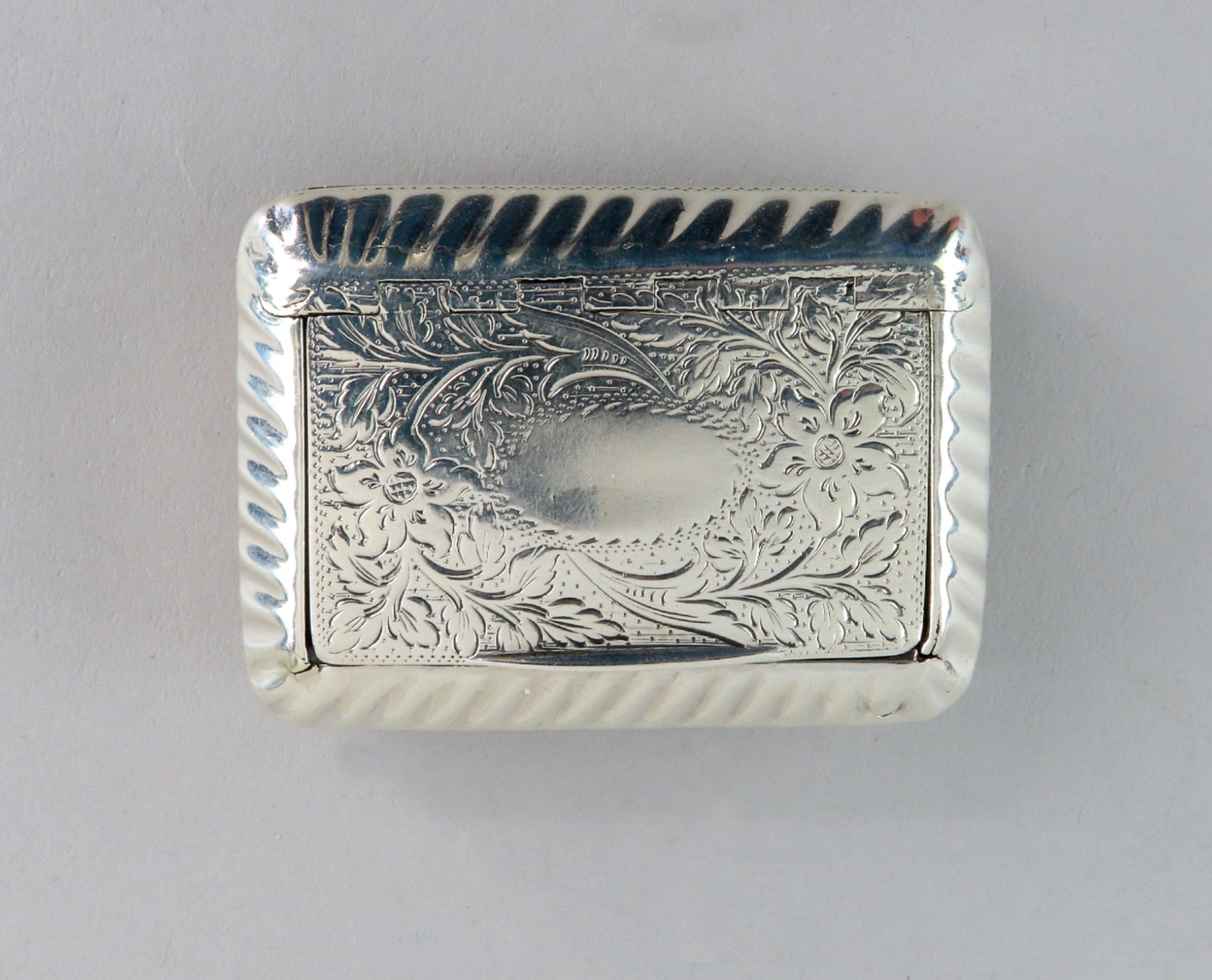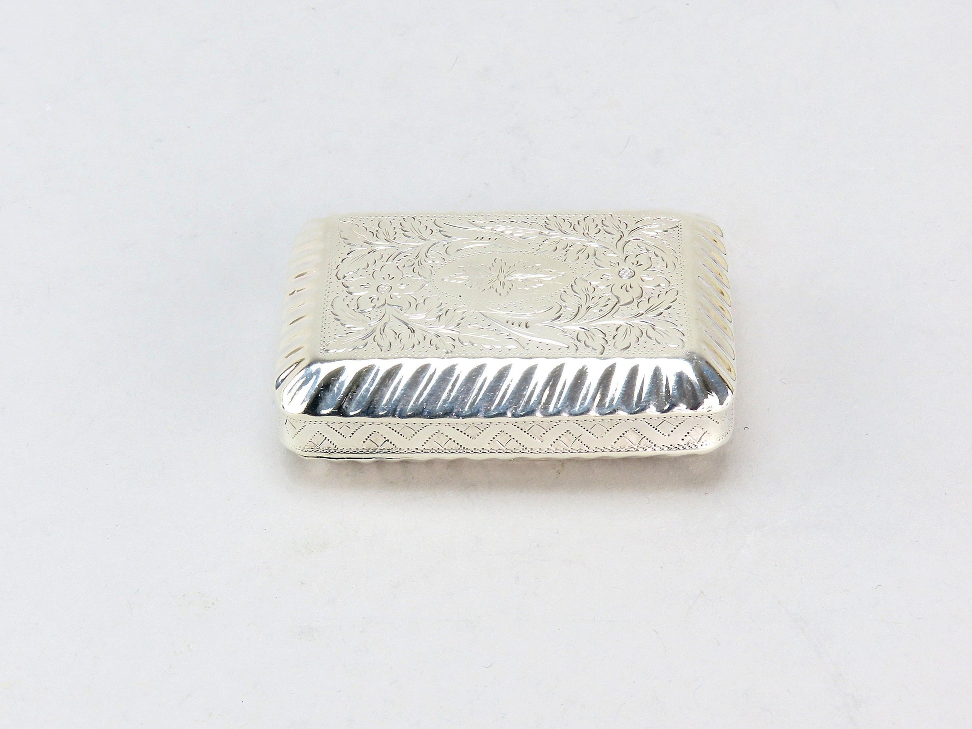 Presented is an antique, English sterling silver vinaigrette or scent box made in Birmingham in 1818. This piece has a very unusual design, a box within a box. The outside top lid and bottom are beautifully engraved. The sides are accented with crisp fluting. The inside grill of the scent box has a beautiful pierced design. The inside of the box and grill are all gold-washed. The hinge to the outside lid and the hinge to the inside grill to the scent box are in great working condition.