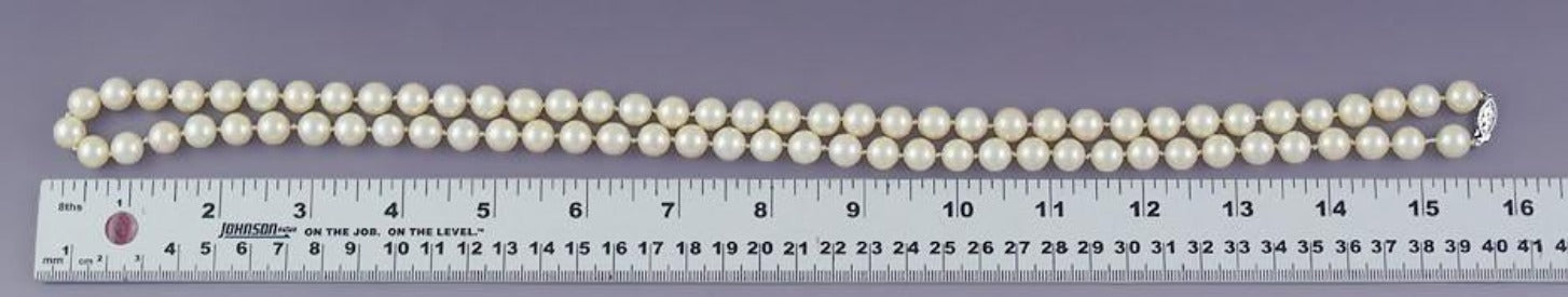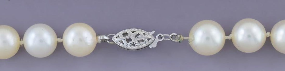 Presented is a lovely, long strand of cultured Akoya pearls with a 14 karat white gold clasp. The pearls are approximately 9mm in diameter (ranging from 8.9 to 9.1 millimeters). The pearls are individually knotted. The pretty, openwork clasp is 14 karat white gold.