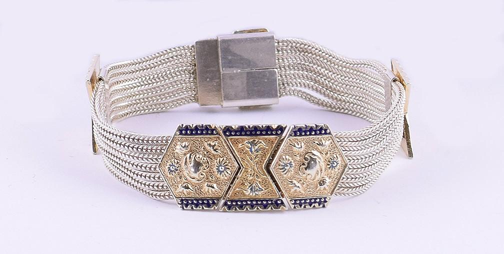 Presented is a very interesting gilt silver and enameled clasp bracelet.