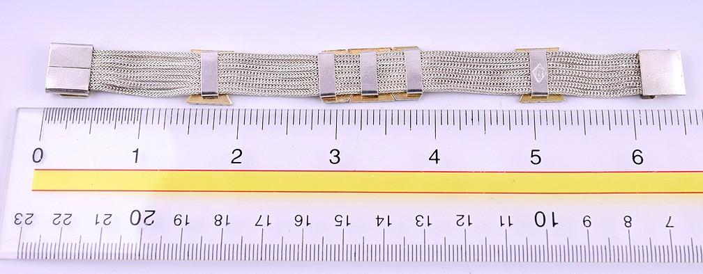 It features geometric shapes with blue, green, and black enamel and golden forms. These slider-type sections of the bracelet are strung on 7 silver chains.
