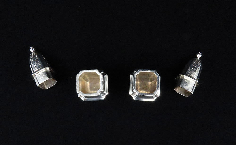 Each shaker is hallmarked with the seated Britannia mark for 958 purity silver, the lion's head erased for the city of London, the date letter I for 1924, and the maker's mark for Crichton Bros. These marks also appear on the lip of the lid, which we show in the photographs. The undersides are also marked Crichton & Co and Made in England.
