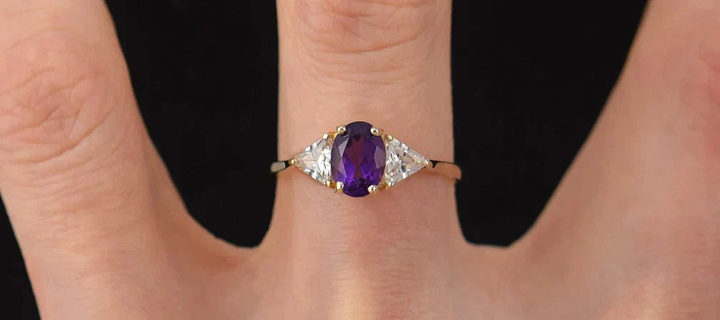 This piece features a center, oval-cut, purple amethyst stone.