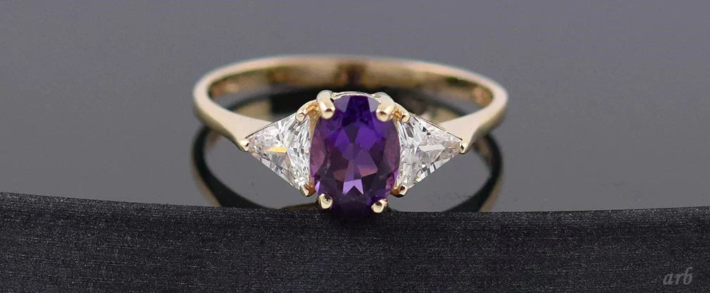 Fine 10k Yellow Gold, Purple Amethyst and Clear Trillions Stones Ring Size 6.75