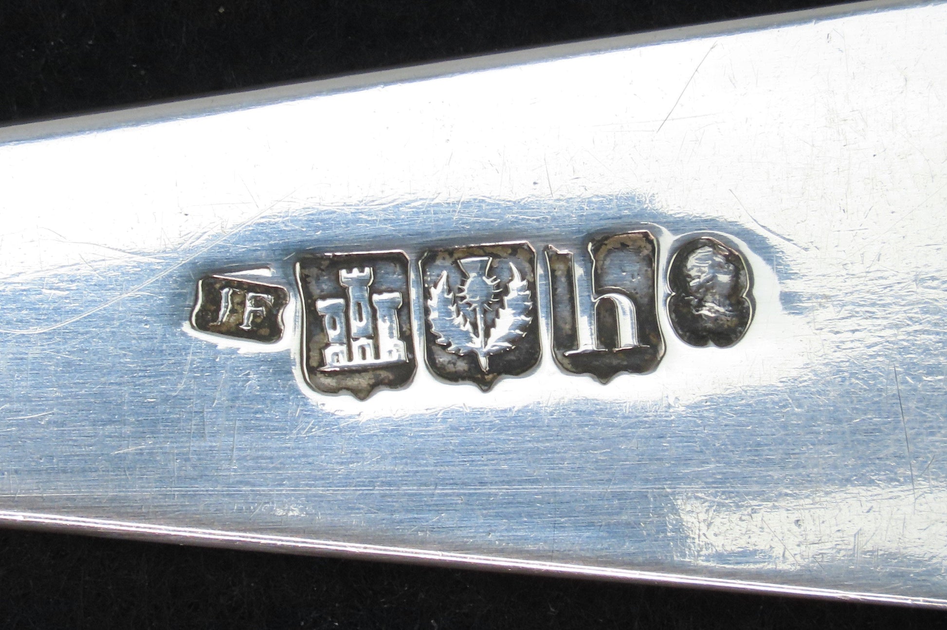 This piece is hallmarked with the Scottish thistle for sterling silver, the city mark for Edinburgh, the date letter h for 1813, the duty stamp of King George III's head, and the maker's mark JF, possibly IF.